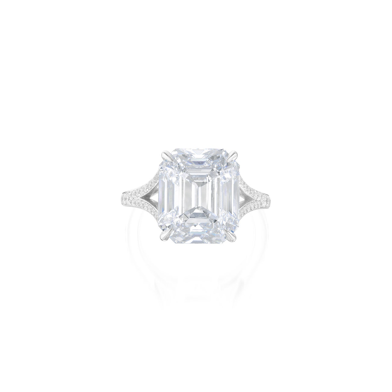 Set with an emerald-cut diamond weighing 10.00 carats, to the brilliant-cut diamond shoulders, mounted in white gold, size 6.