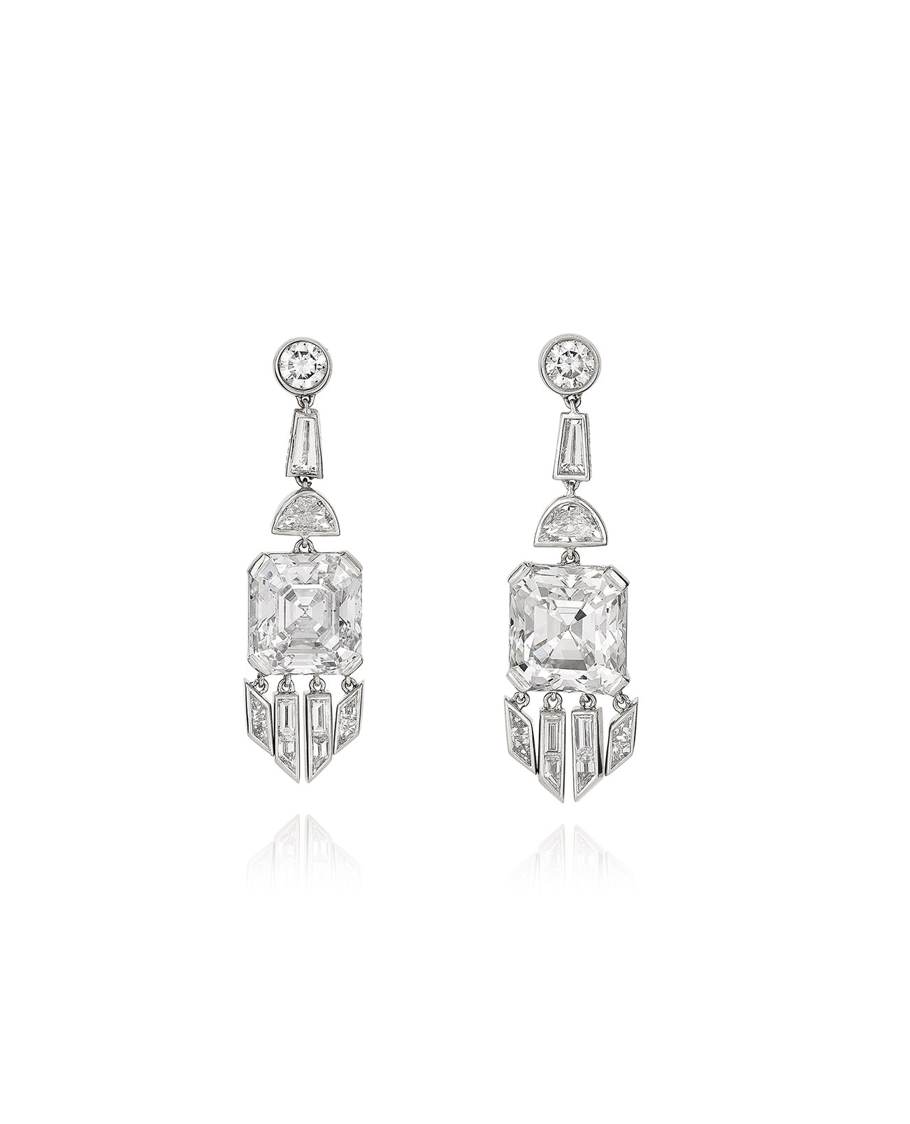 Each set with a step-cut diamond weighing 4.17 carats and 4.28 carats respectively, accented with brilliant-cut, half-moon and baguette diamonds, length approximately 34mm, post and butterfly fittings.