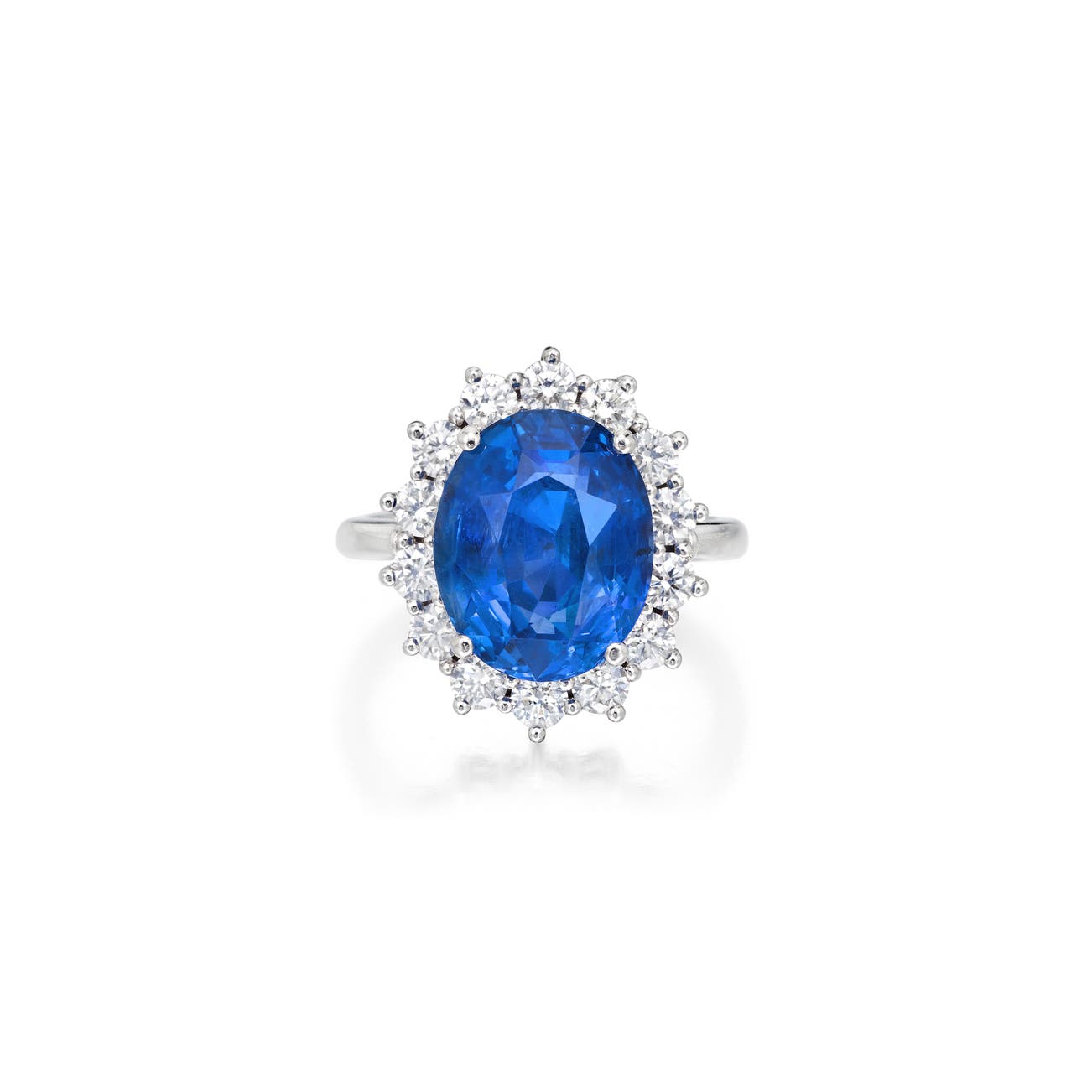 Set with an oval sapphire weighing 9.02 carats, within a frame of brilliant-cut diamonds, mounted in 18K white gold, size 7 1/4.