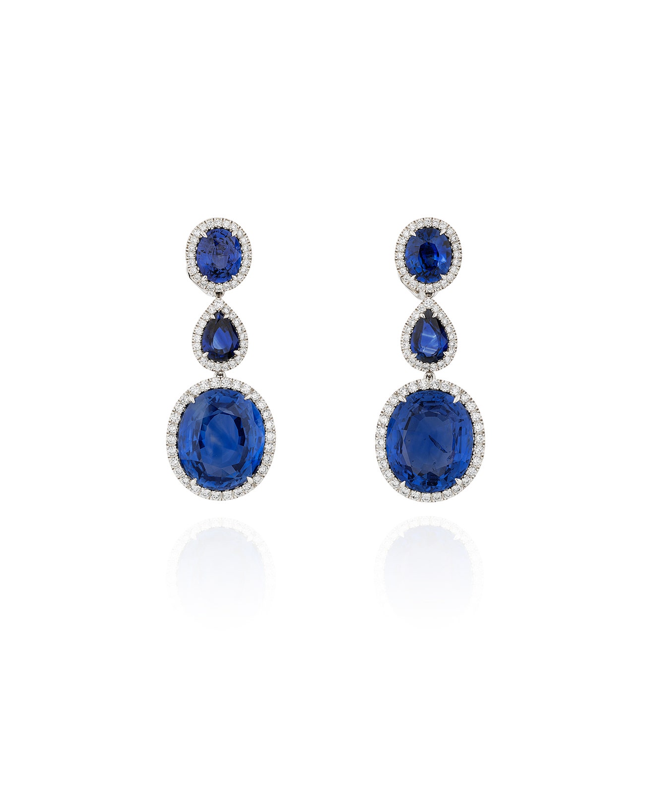 Each set with an oval and a pear-shaped sapphire, supporting a larger sapphire weighing 11.79 and 10.47 carats respectively, length approximately 40mm, post and hinged-back fittings.