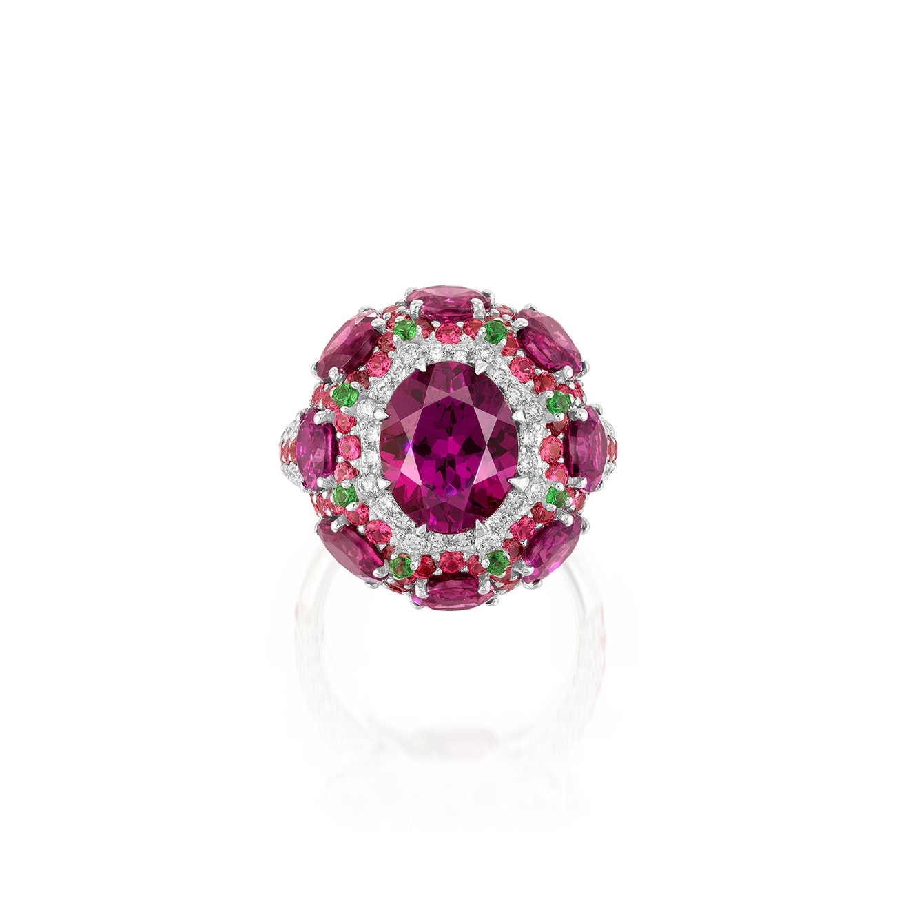 Set with an oval rhodolite garnet weighing approximately 3.51 carats, decorated with circular-cut rhodolite garnets, pink spinels, tsavorite garnets and brilliant-cut diamonds, size 6.