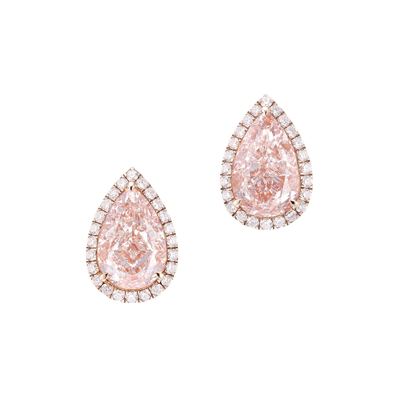 Each set with a pear-shaped very light pink or faint pink diamond weighing 5.01 or 5.00 carats respectively, within a brilliant-cut diamond surround, post and butterfly fittings, length approximately 17 mm.