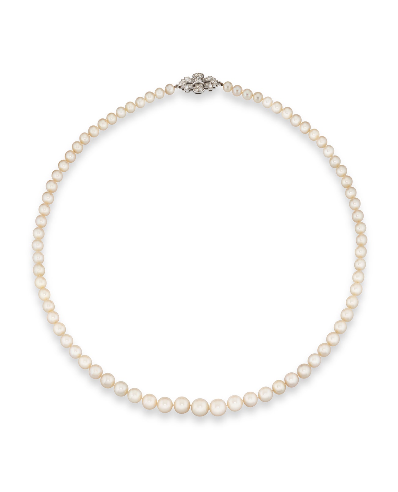 Composed of a single strand of natural pearls measuring from approximately 5.10 to 9.10mm, the clasp set with circular-cut and baguette diamonds, length approximately 530mm.
