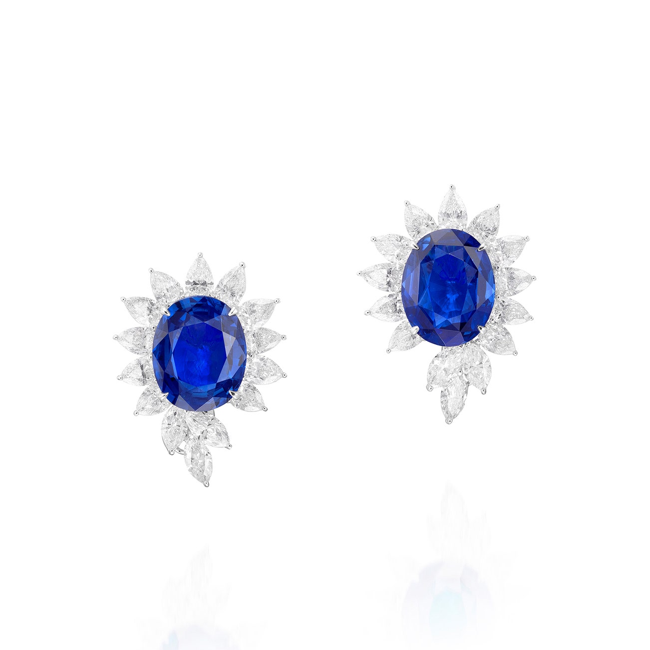 Each set with an oval sapphire weighing 9.87 and 8.59 carats, within a surround of pear- and marquise-shaped diamonds, mounted in white gold, post and hinged back fittings, length approximately 29 mm.