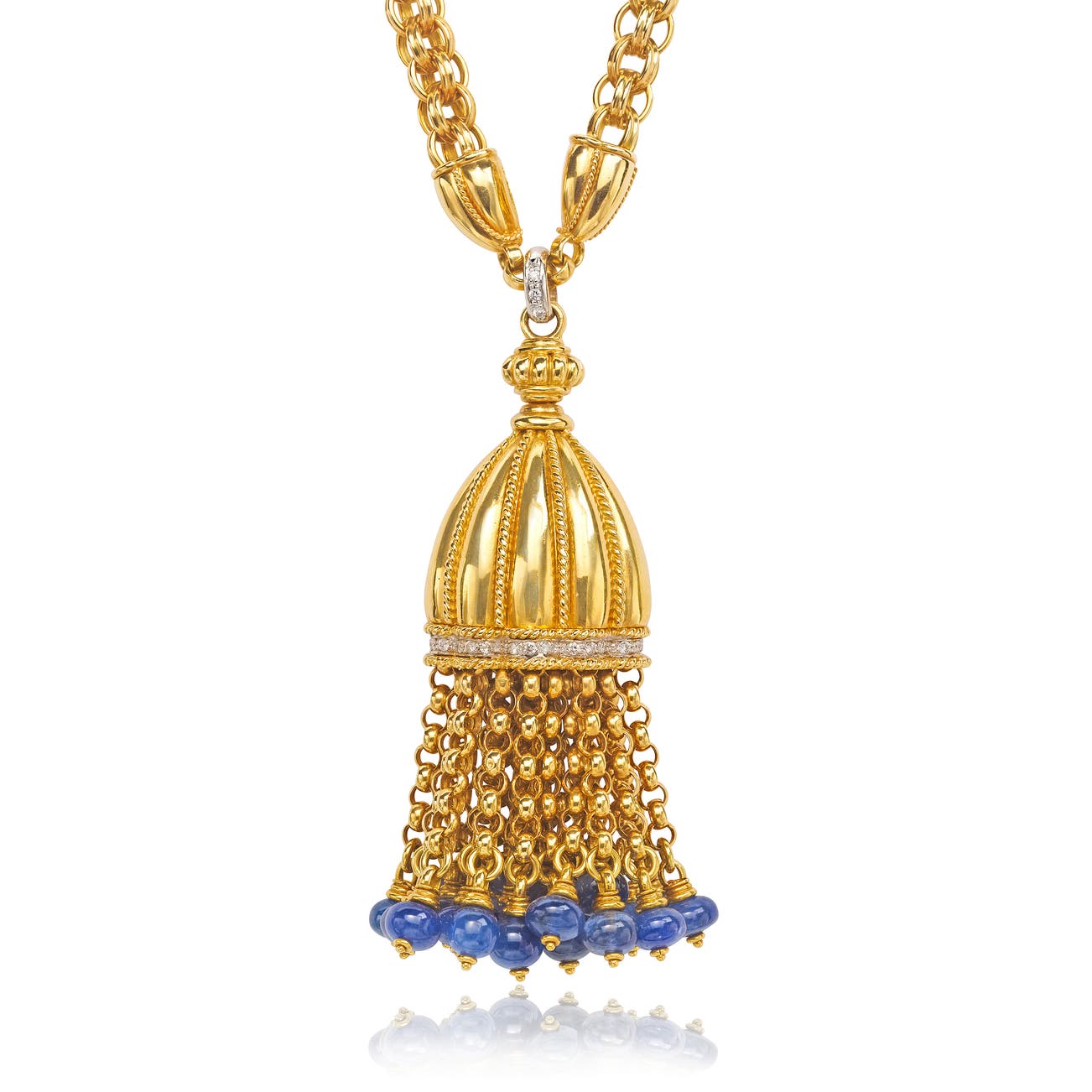 Of linked chain design, suspending a tassel composed of gold links and sapphire beads, accented by brilliant-cut diamonds, mounted in 18K yellow and white gold, length approximately 18 inches, adjustable to 21 inches with extension, stamped ITALY.
