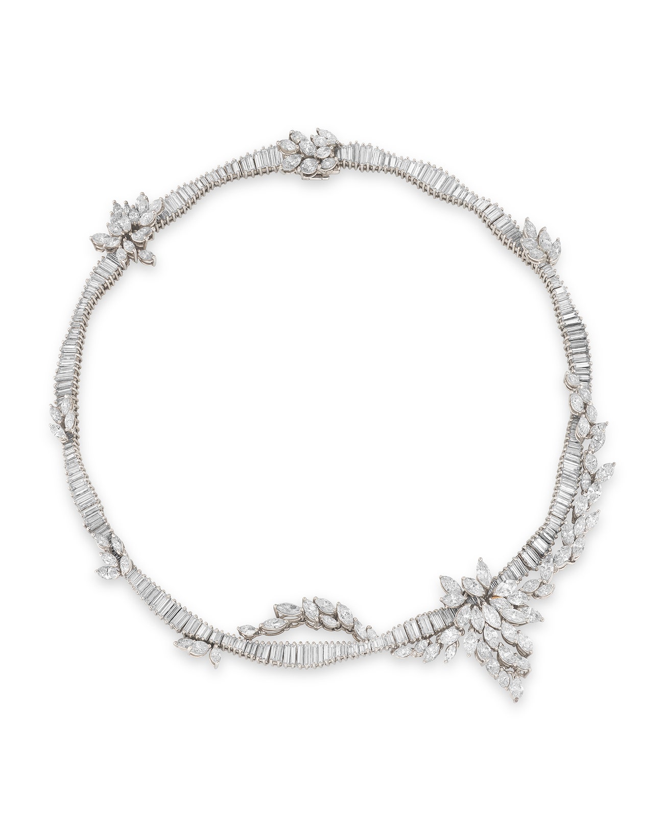 Set with baguette diamonds, accented with marquise-shaped diamond clusters,