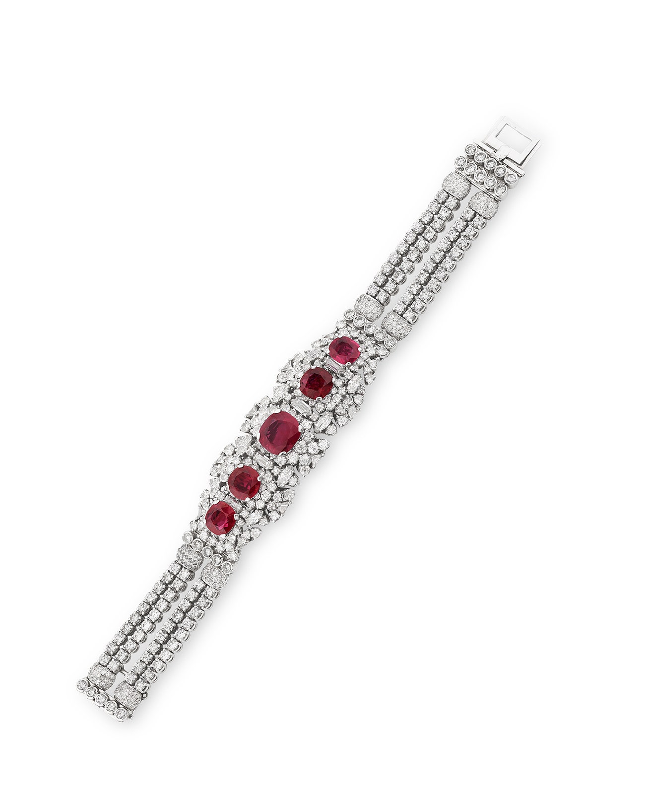 Set with cushion-shaped and oval rubies, accented with triangular, marquise-, shield-shaped, brilliant- and single-cut diamonds, length approximately 171mm, French assay marks for platinum and gold.