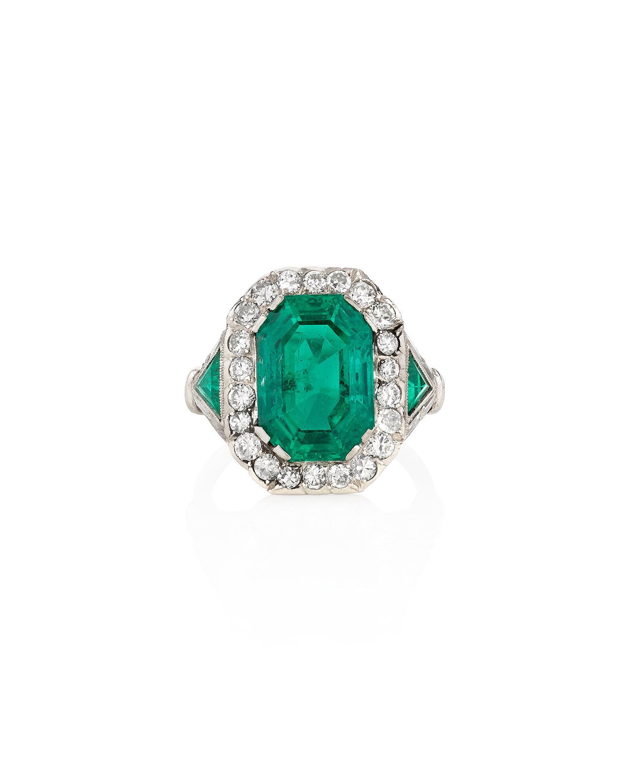 Set with an octagonal step-cut emerald weighing 5.42 carats, highlighted with triangular emeralds and brilliant-cut and baguette diamonds, size 52.