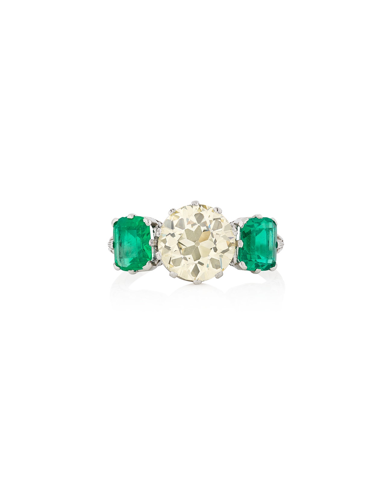 Set with a circular-cut diamond weighing 2.84 carats, between step-cut emeralds, size 55.