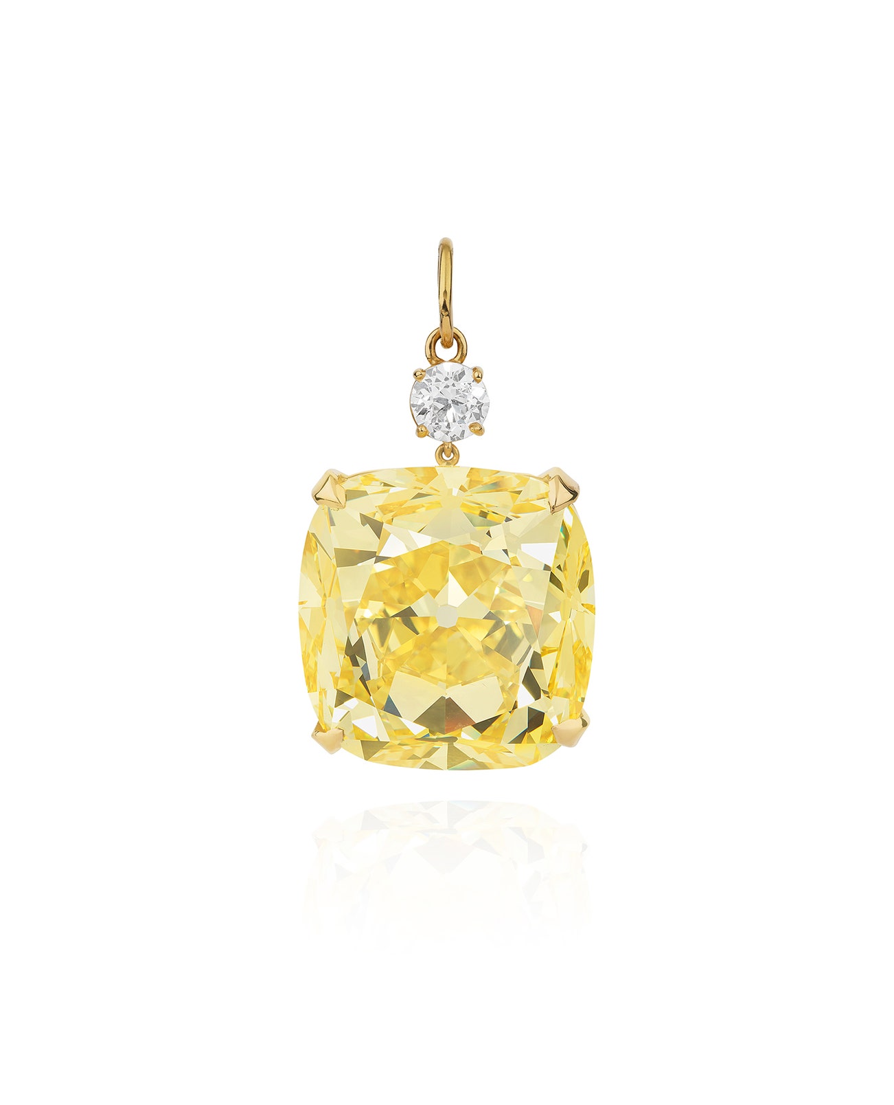 Set with an old mine brilliant-cut fancy vivid yellow diamond weighing 53.14 carats, highlighted with a circular-cut diamond, length approximately 35mm.
