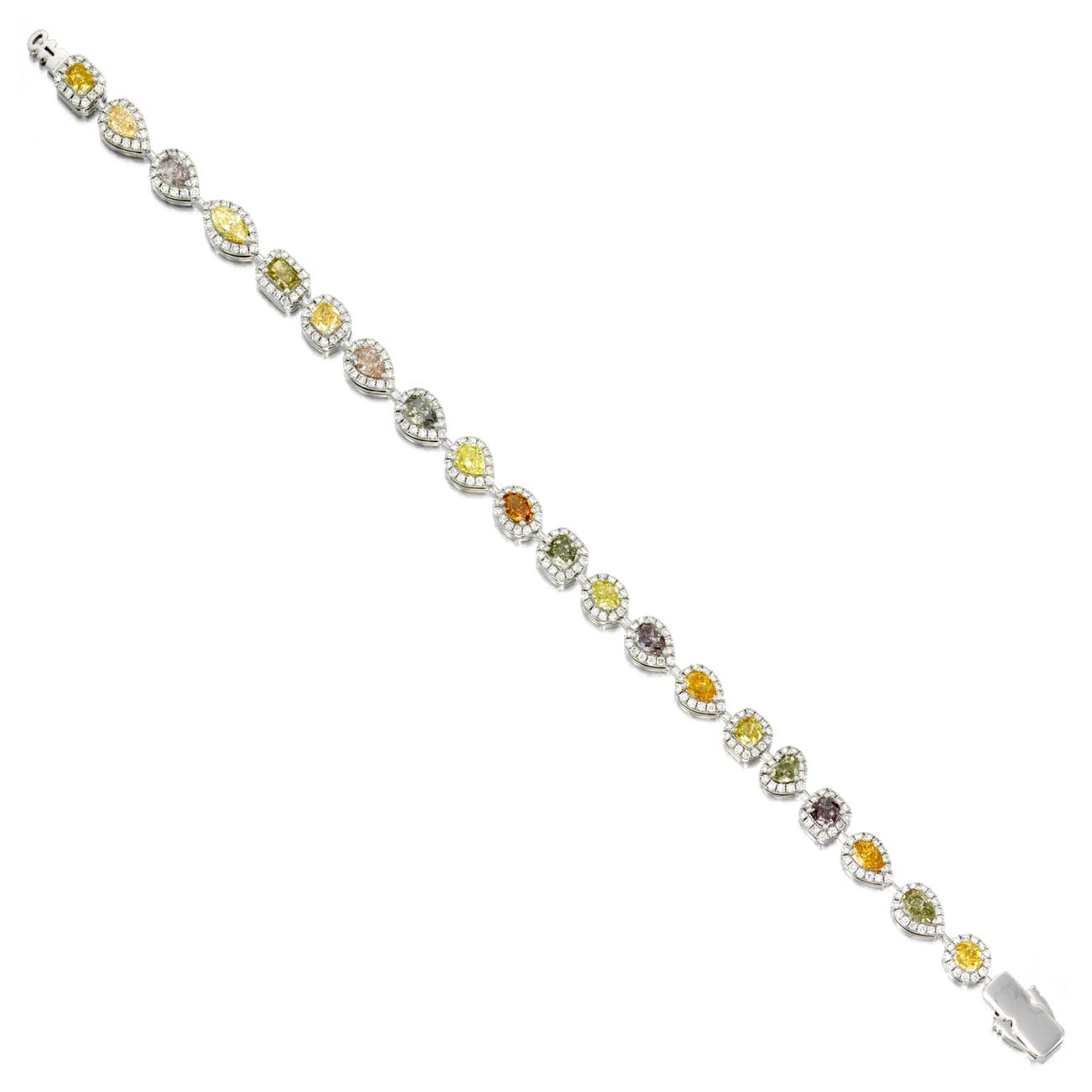 Set with variously colored oval, pear-, cushion-, heart- and marquise-shaped diamonds, highlighted with near-colorless brilliant-cut diamonds, mounted in 18k white gold, length approximately 7 1/2 inches.
