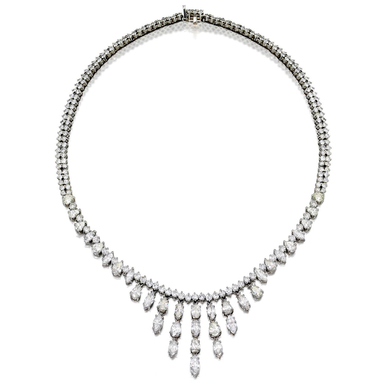 Set with oval, pear-, and marquise-shaped diamond fringe, suspended from a line of brilliant-cut, pear-, marquise-shaped and oval diamonds, graduating into a double-line of brilliant-cut diamonds, mounted in platinum, length approximately 15 inches.