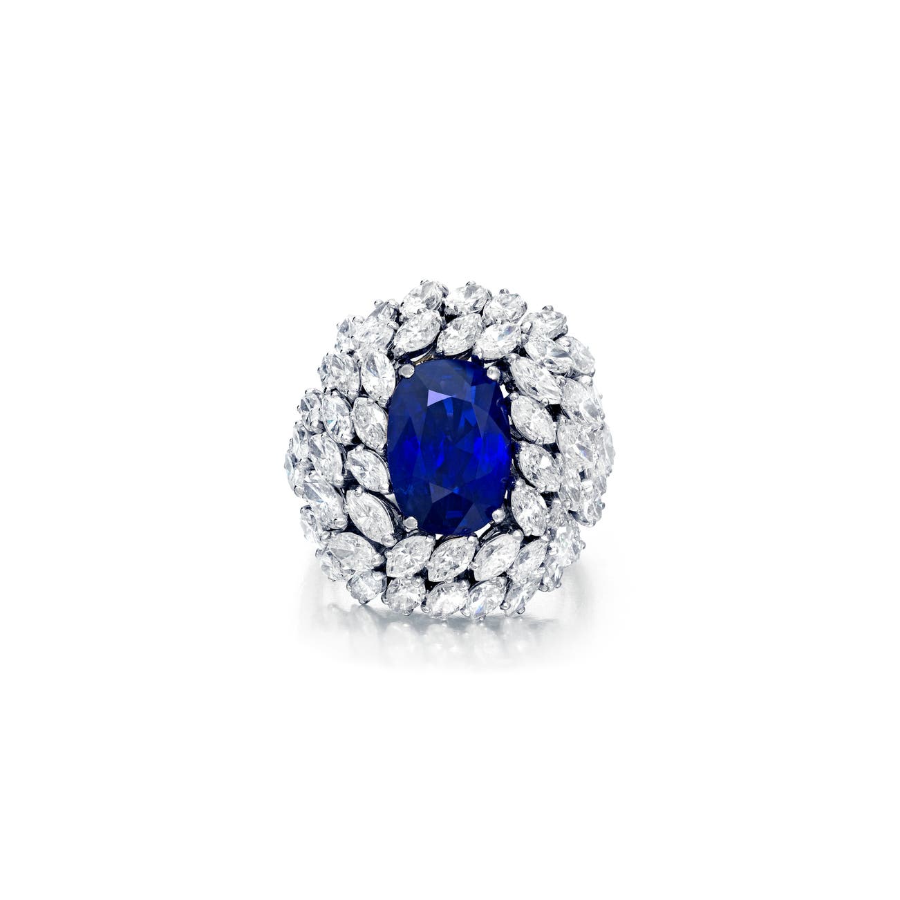 Set with a oval sapphire weighing 8.03 carats, within a frame of marquise-shaped diamonds, mounted in platinum, with French assay marks, maker's mark, size 9 1/2.