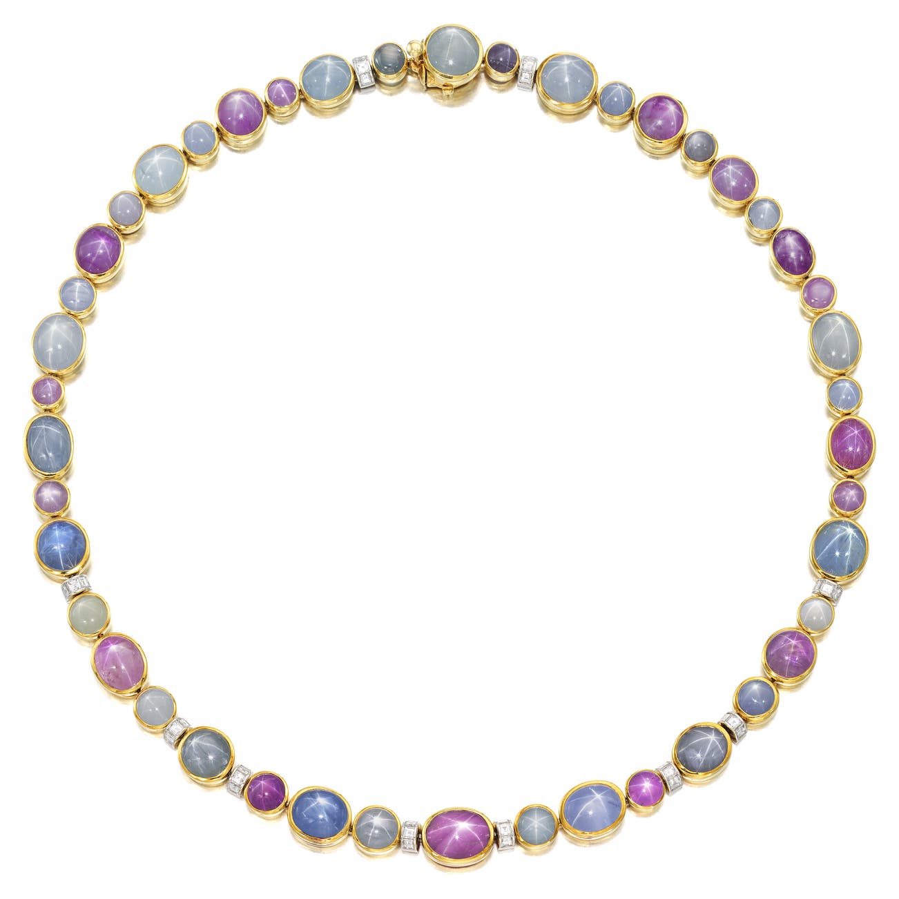 Set with cabochon star sapphires highlighted with square-cut diamonds, mounted in 18k yellow gold and platinum, length approximately 18 inches.