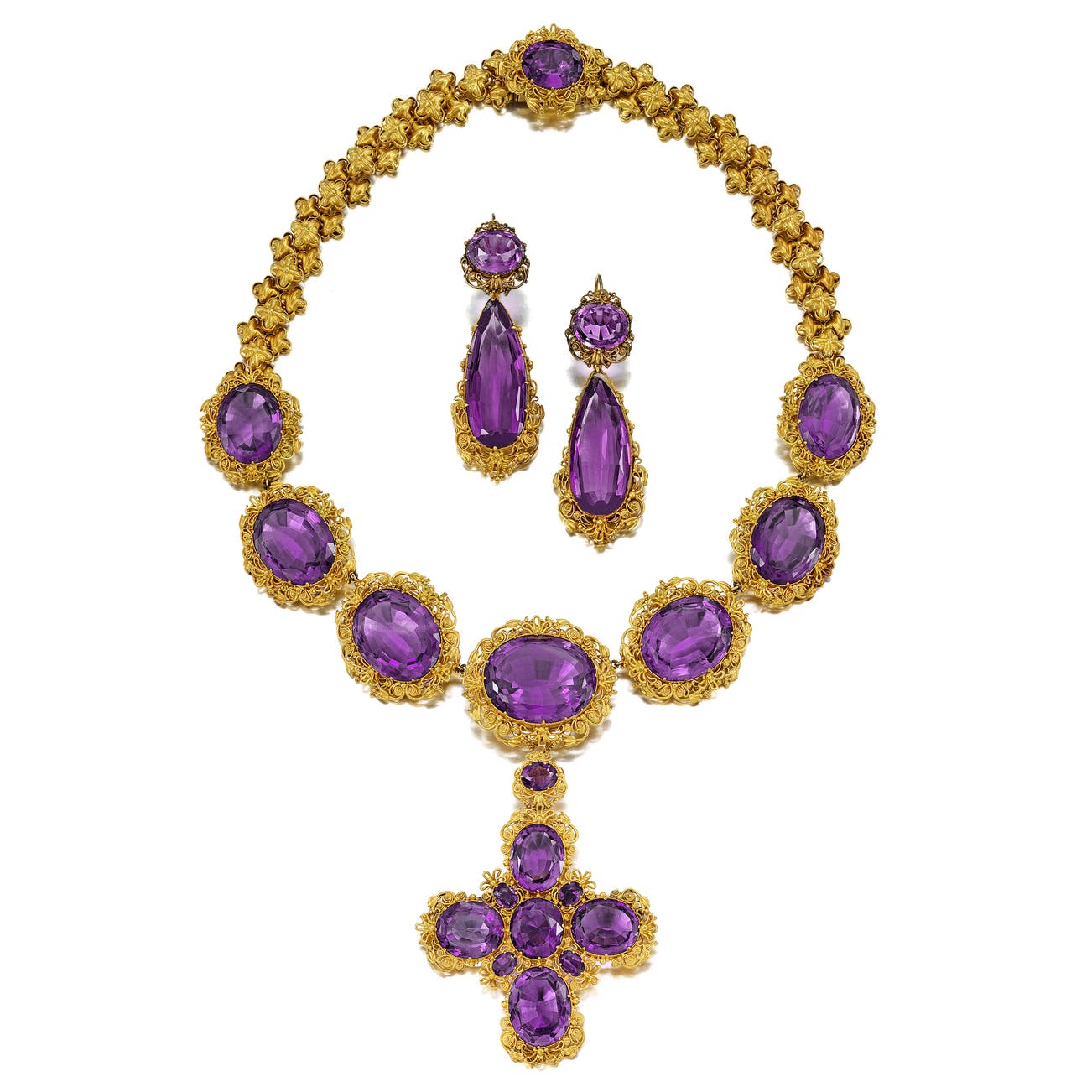 Comprising: a necklace, set with oval amethysts, length approximately 18 1/2 inches, the cruciform pendant detachable and may be worn as a brooch, measuring approximately 2 9/16 x 2 3/8 inches, and a pair of earrings, length approximately 2 15/16 inches, hook and hinged-back fittings, mounted in 14k gold topped with 22k yellow gold.