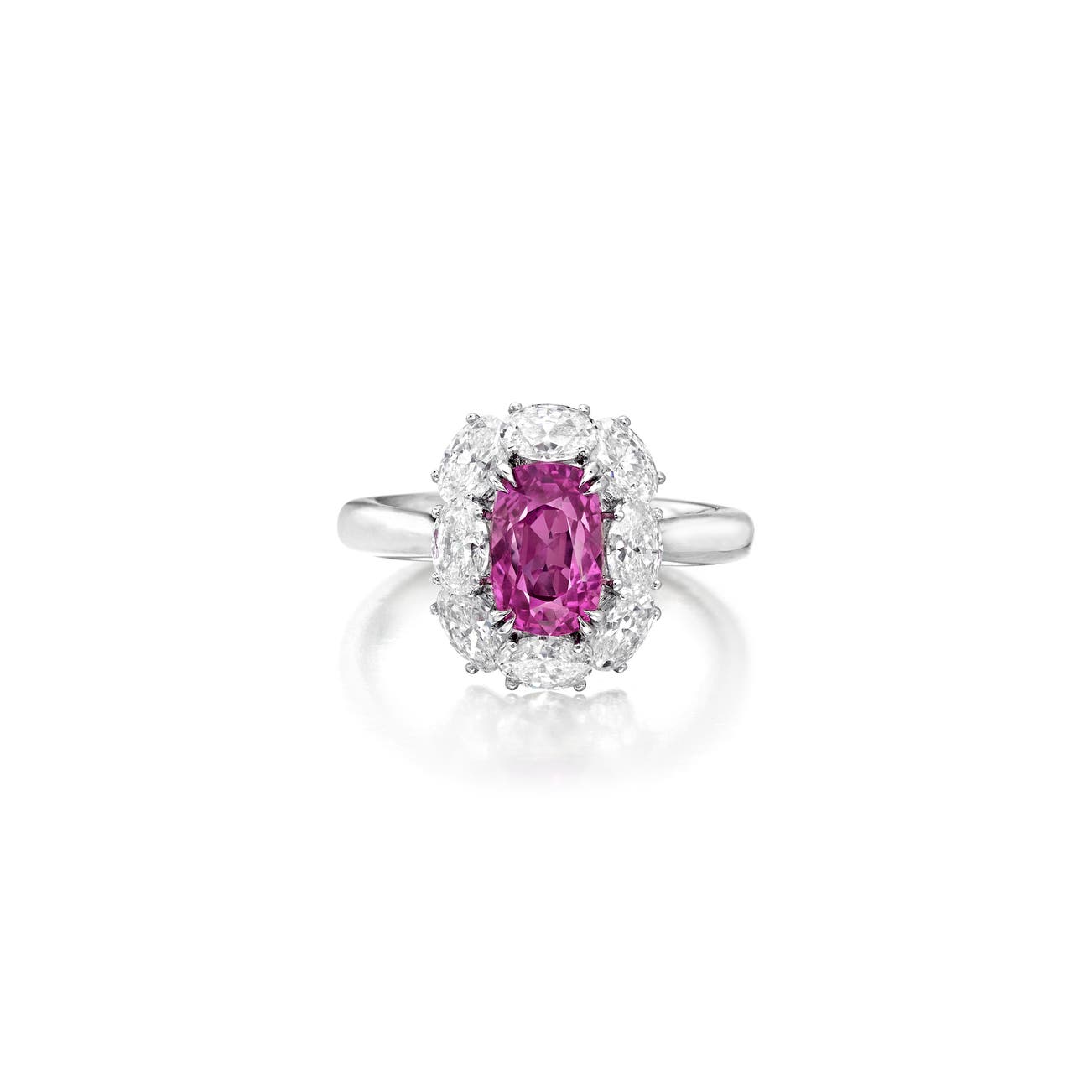 Set with a cushion-shaped pink sapphire weighing 2.92 carats, within a halo of oval diamonds, mounted in platinum, size 6 1/2.