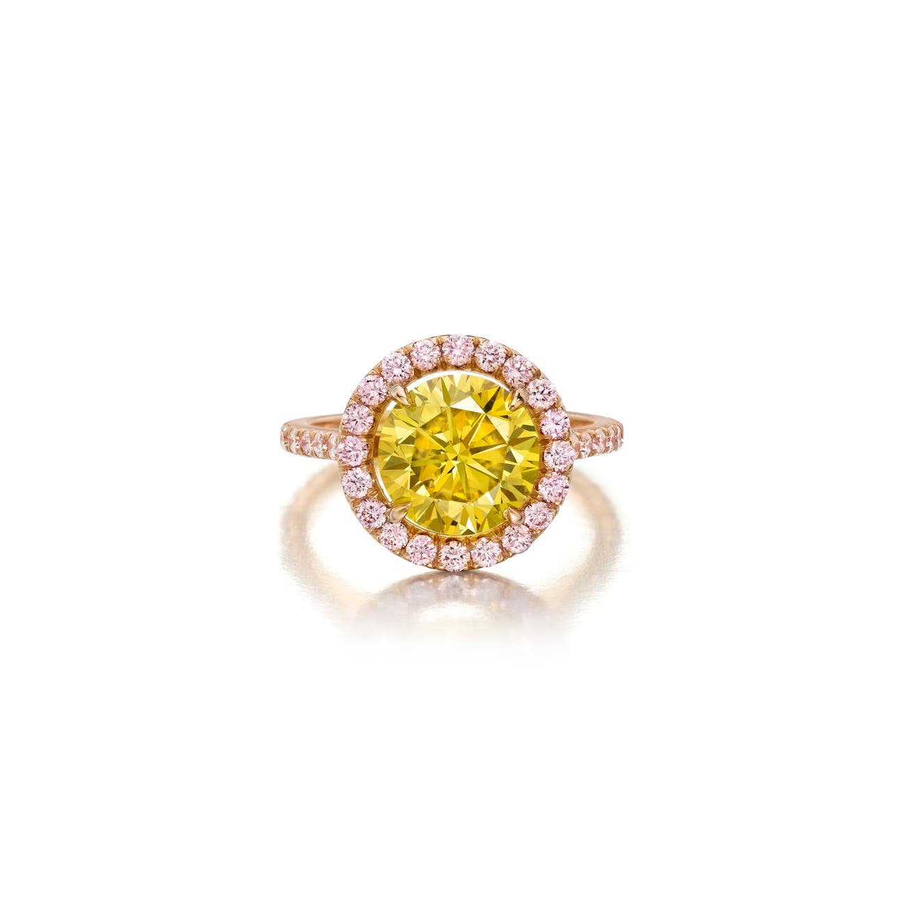 Set with a round brilliant fancy deep yellow diamond weighing 2.72 carats, surrounded by brilliant-cut diamonds and similarly cut diamonds of pink tint, mounted in 18k rose gold, size 5 3/4.