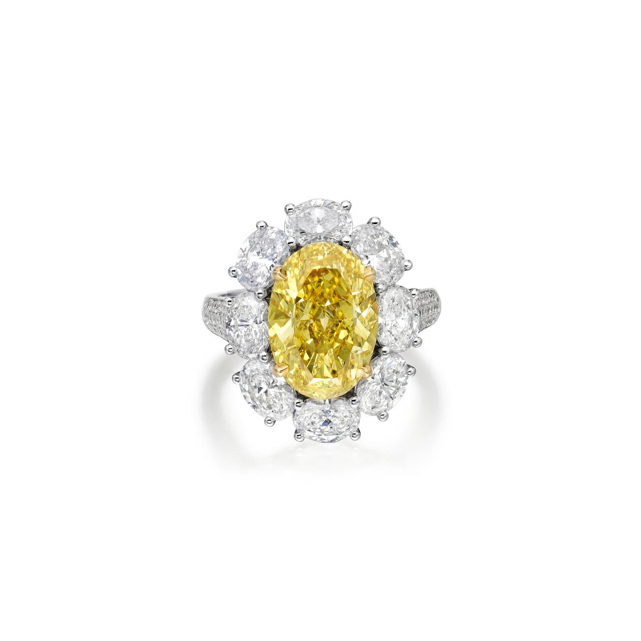 Set with an oval fancy vivid yellow diamond weighing 4.43 carats, accented by oval and brilliant-cut diamonds, mounted in platinum, size 6 1/4.