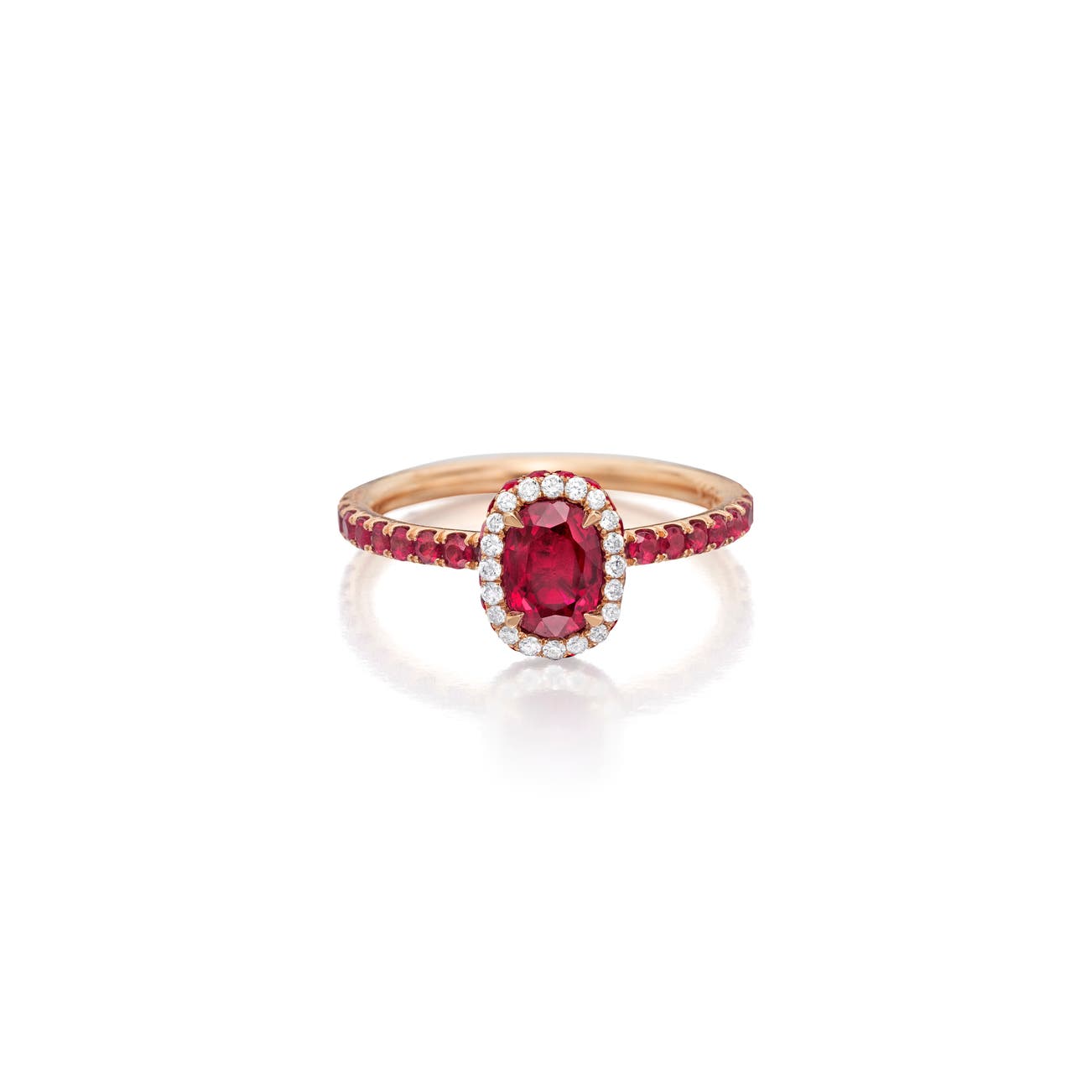 Set with an oval ruby, accented by brilliant-cut diamonds, further accented by circular-cut rubies, mounted in 18k rose gold, size 6.