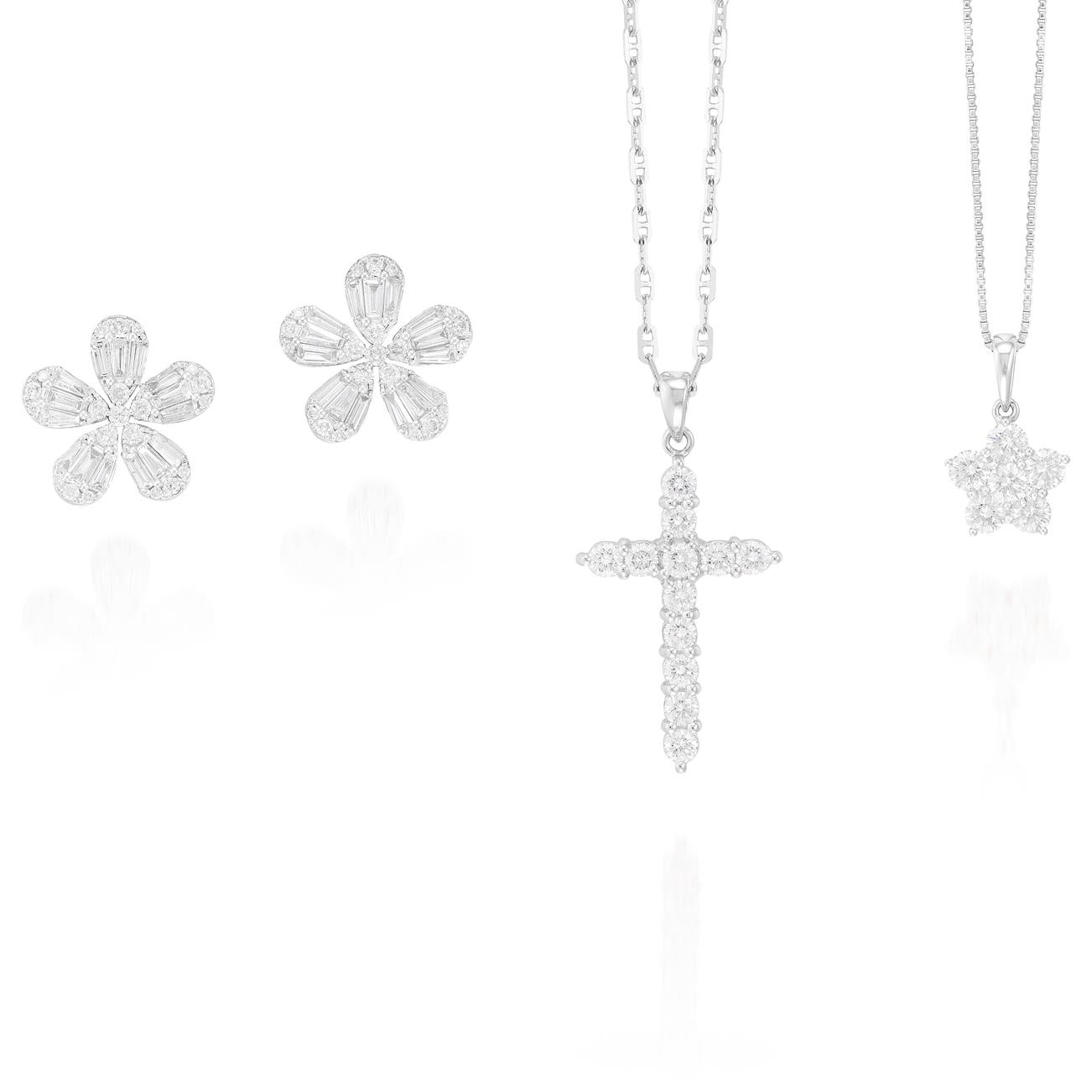 Two necklaces, one suspending a cross pendant and the other a flowerhead pendant, set with brilliant-cut diamonds, to a white gold or platinum link chain, pendant lengths approximately 31 and 15 mm, chain lengths approximately 450 and 455 mm respectively; and a pair of earrings, each of floral design, set with tapered baguette and brilliant-cut diamonds, earrings with post and butterfly fittings, length approximately 15 mm; all mounted in white gold.
