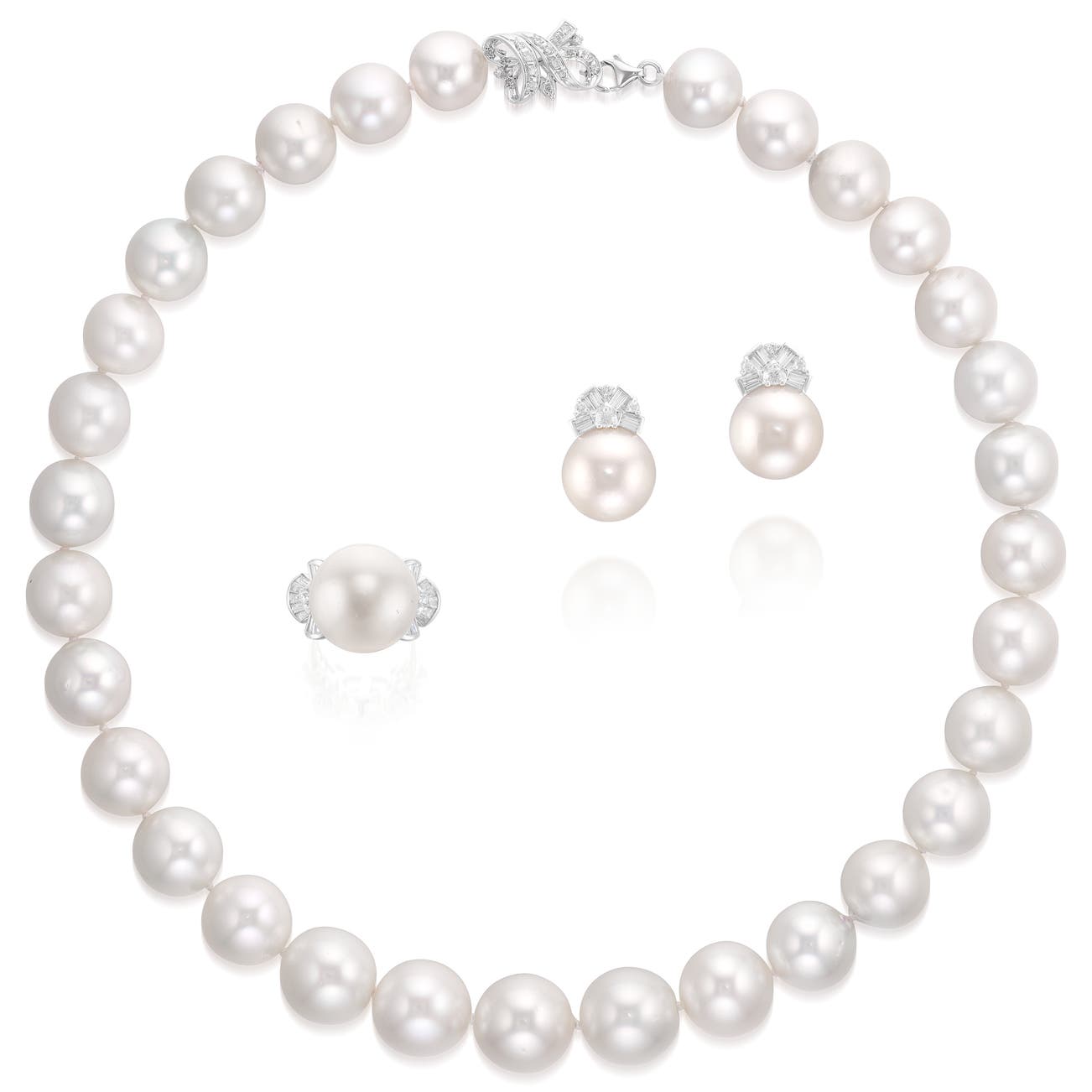 Comprising: a pair of ear clips, each set with a cultured pearl measuring approximately 14.06 and 14.04 mm respectively, decorated with tapered baguette and brilliant-cut diamonds; a ring of similar design, set with a cultured pearl measuring approximately 16.48 mm; and a necklace composed of thirty-one graduated cultured pearls measuring approximately 14.76 to 12.02 mm, completed by clasp decorated with single-cut diamonds; all mounted in white gold, ear clips and necklace lengths approximately 19 and 425 mm respectively, ring size 3½.