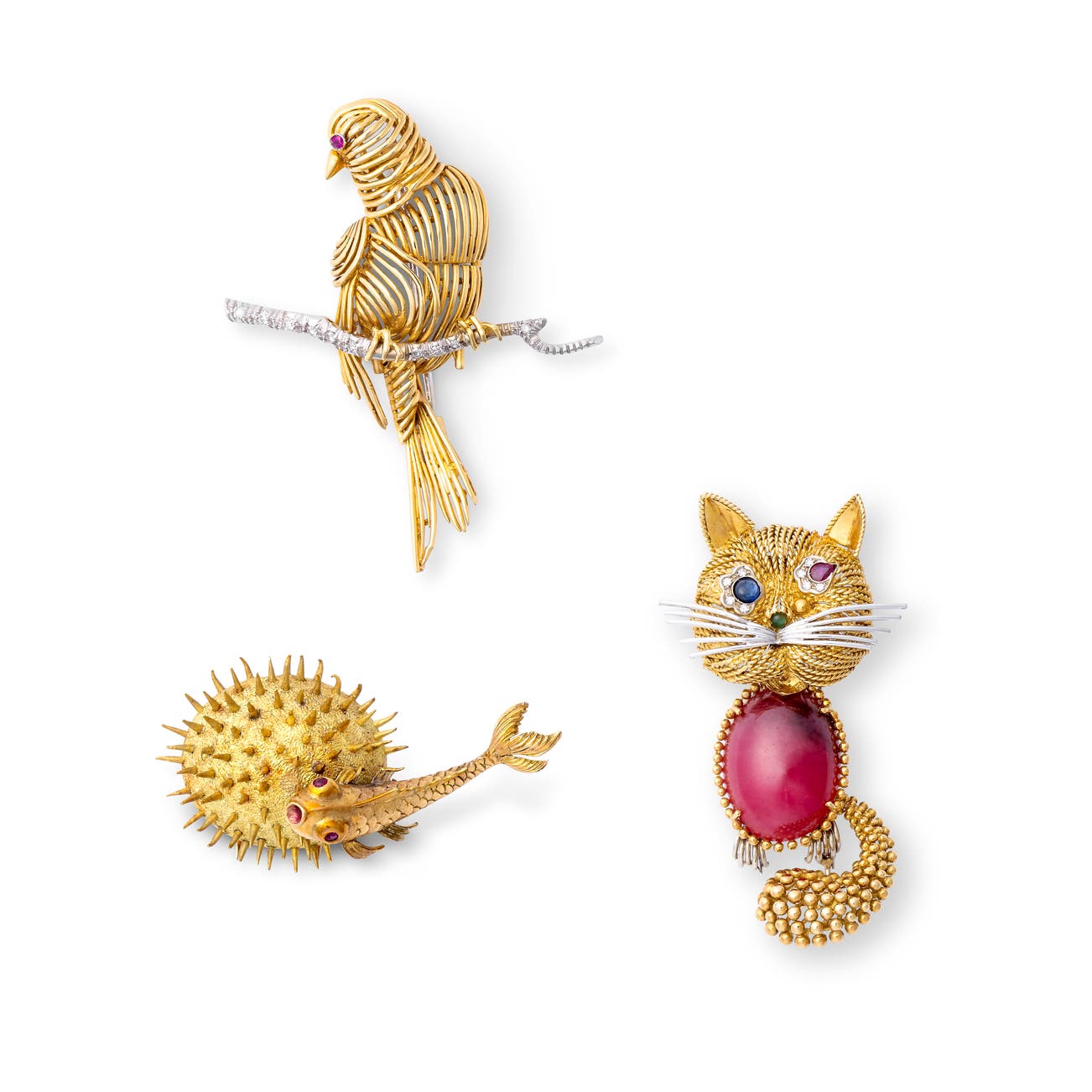 One brooch designed as a cat, the eyes set with a cabochon sapphire and a pear-shaped ruby, decorated with single-cut diamonds, the nose set with a cabochon emerald, the body with cabochon rhodonite, measuring approximately 60 x 32mm, Italian assay mark for gold, the second brooch modelled as a bird perched on a branch, the eye set with a circular-cut ruby, the branch decorated with single-cut diamonds, measuring approximately 50 x 42mm, the third brooch modelled as a fish en tremblant resting on a sea urchin, the eyes set with circular-cut rubies, measuring approximately 52 x 38mm.