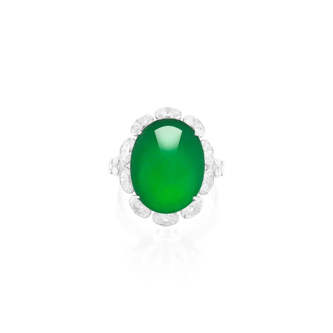 Set with an oval jadeite cabochon measuring approximately 17.35 x 13.50 x 6.73 mm, of emerald green colour and very good translucency, decorated with brilliant-cut diamond gallery, to the oval diamond surround and shoulders, mounted in white gold, size 6¾.