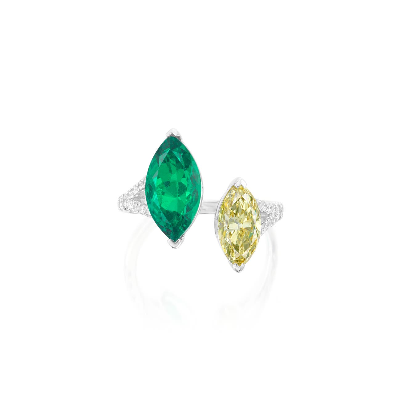 Of toi et moi design, set with a marquise-shaped emerald weighing 2.16 carats and a marquise-shaped fancy intense yellow diamond weighing 1.02 carats, to the bifurcated shoulders, mounted in white gold, size 6.