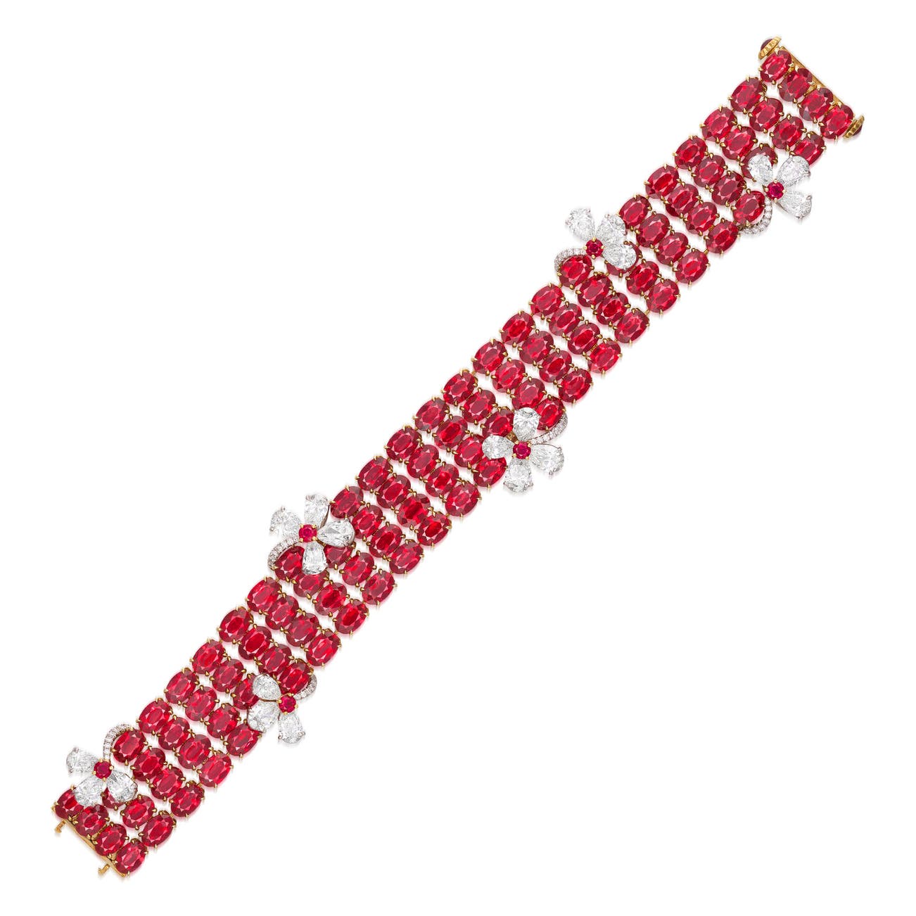 Designed as four rows of oval rubies, to the floral motifs set with circular-cut rubies and pear-shaped and brilliant-cut diamonds, rubies weighing approximately 51.86 carats in total, mounted in yellow gold and platinum, length approximately 160 mm.