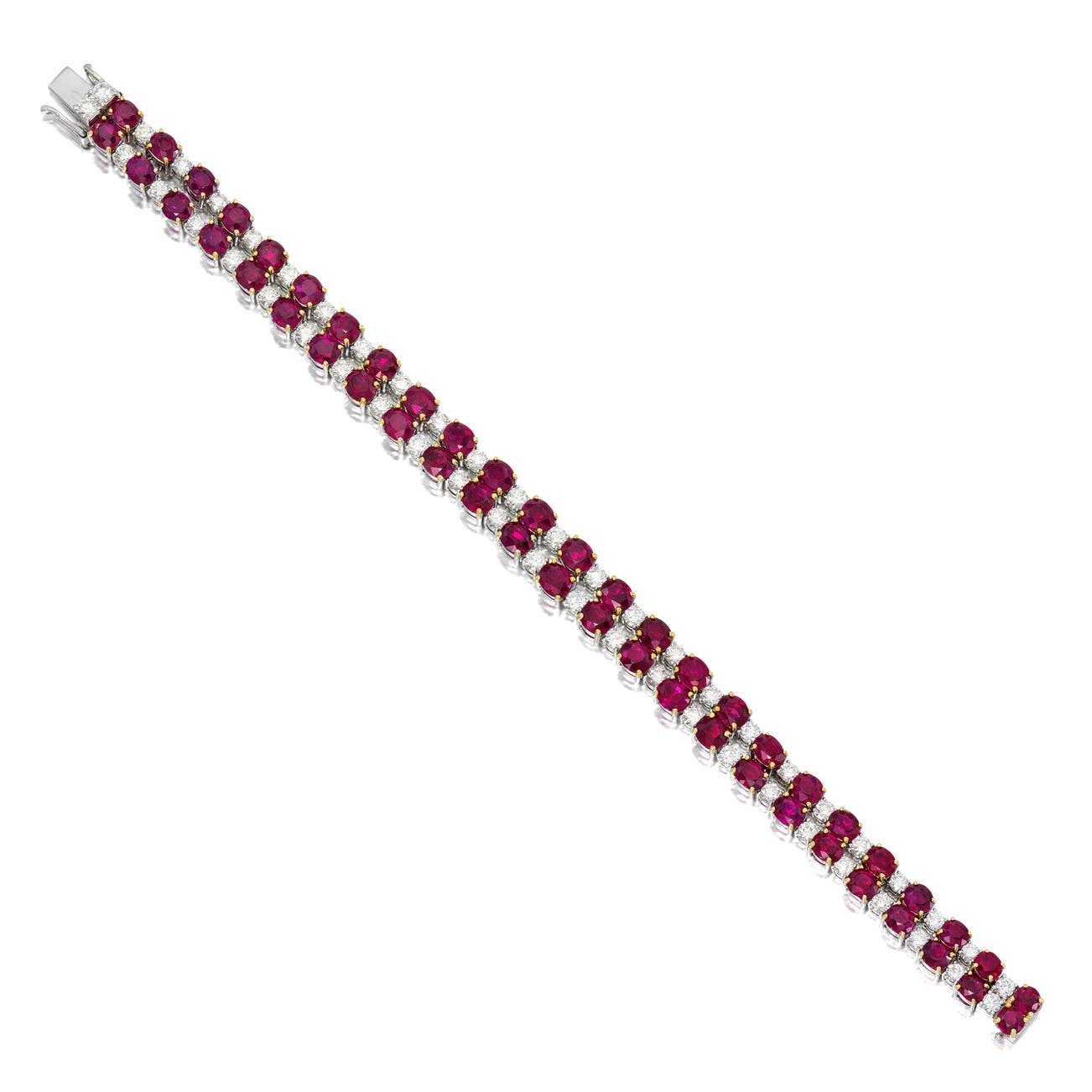 Set with two rows of oval rubies, spaced by brilliant-cut diamonds, mounted in white gold, length approximately 6 3/8 inches.