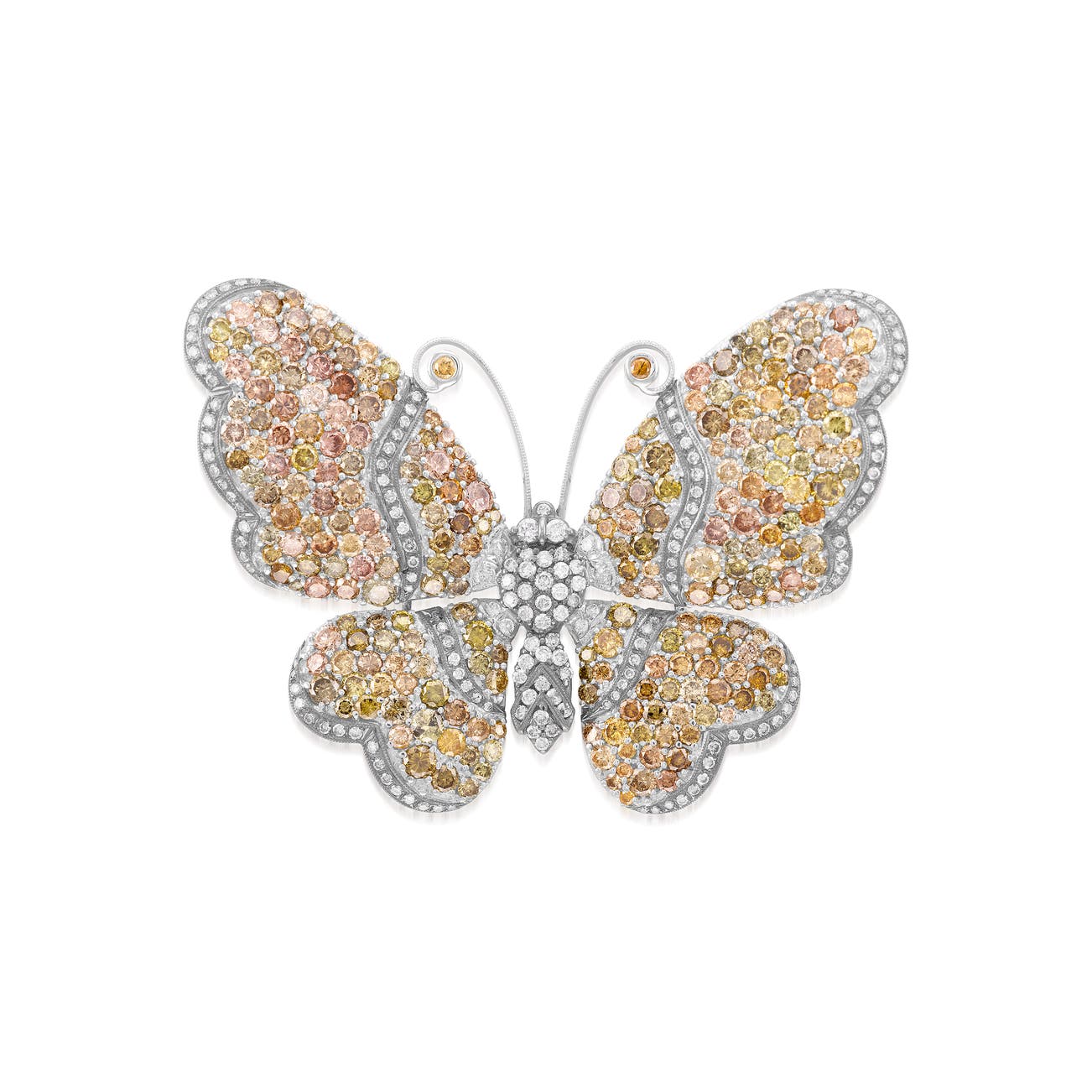 Designed as a butterfly, set with brilliant-cut diamonds and brilliant-cut diamonds of multi-coloured tint, mounted in white and blackened gold, length approximately 51 mm.