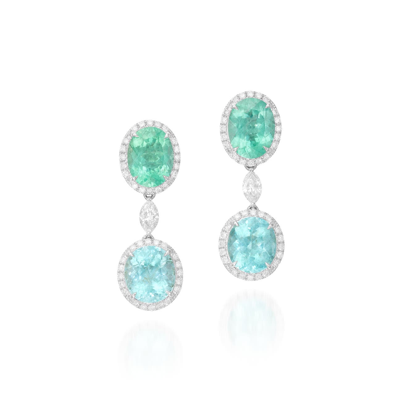 Each set with two Paraíba-type tourmalines weighing 8.86 carats in total, each within a surround of brilliant-cut diamond, decorated with a marquise-shaped diamond, mounted in white gold, post and butterfly fittings, length approximately 30 mm.