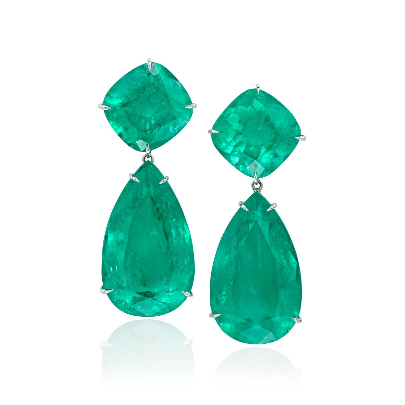 Each set with cushion- and pear-shaped emeralds, mounted in white gold, length approximately 2 inches.