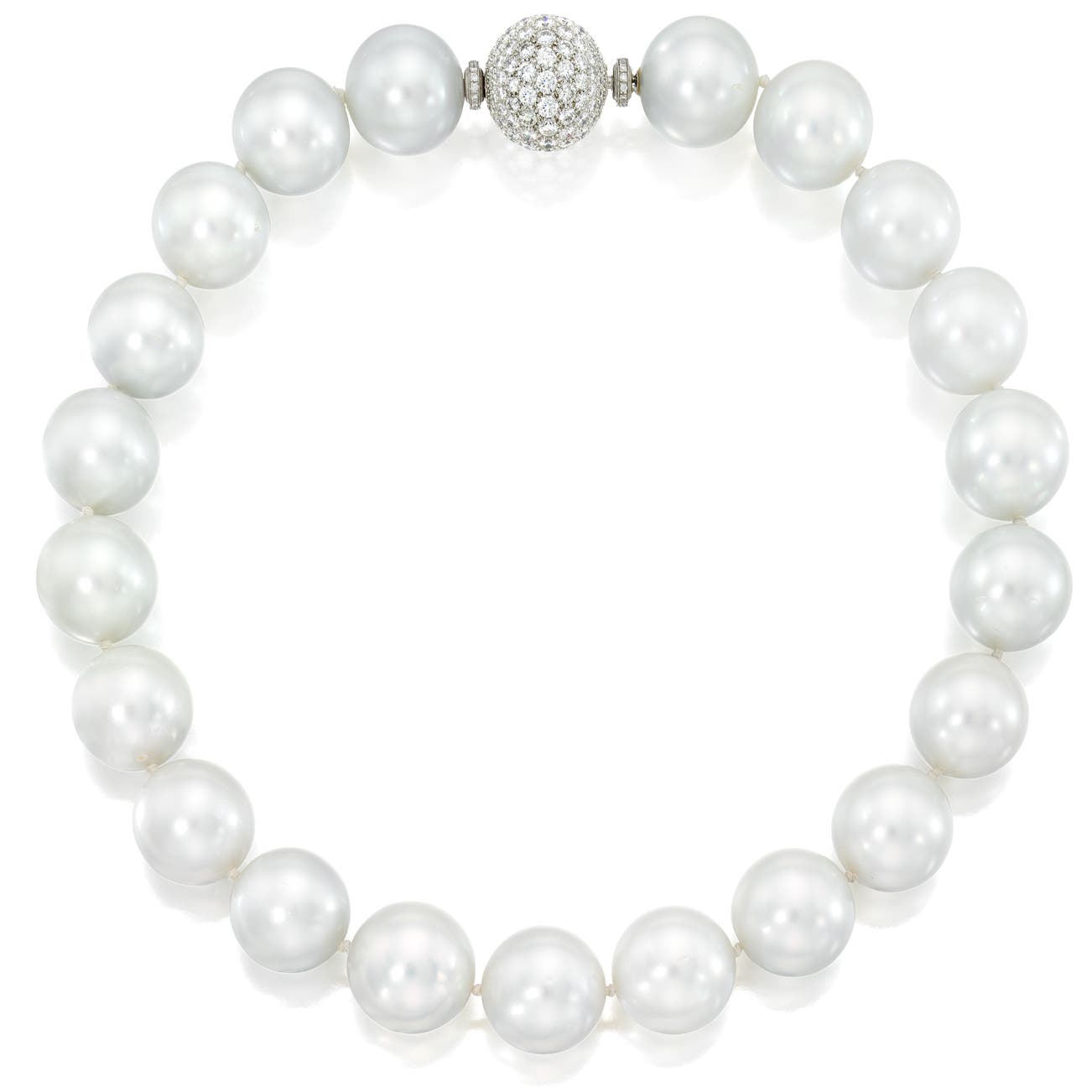 Of twenty-one cultured pearls measuring from approximately 19.10mm to 20.60mm, the ball clasp accented by brilliant-cut diamonds, mounted in platinum, length approximately 18 inches.
