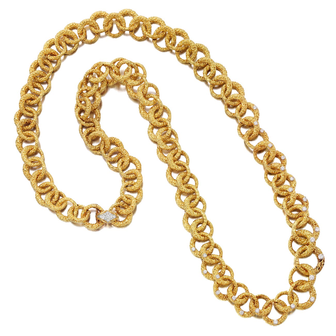 The textured links decorated with brilliant-cut diamonds, mounted in yellow gold, length approximately 31 inches.