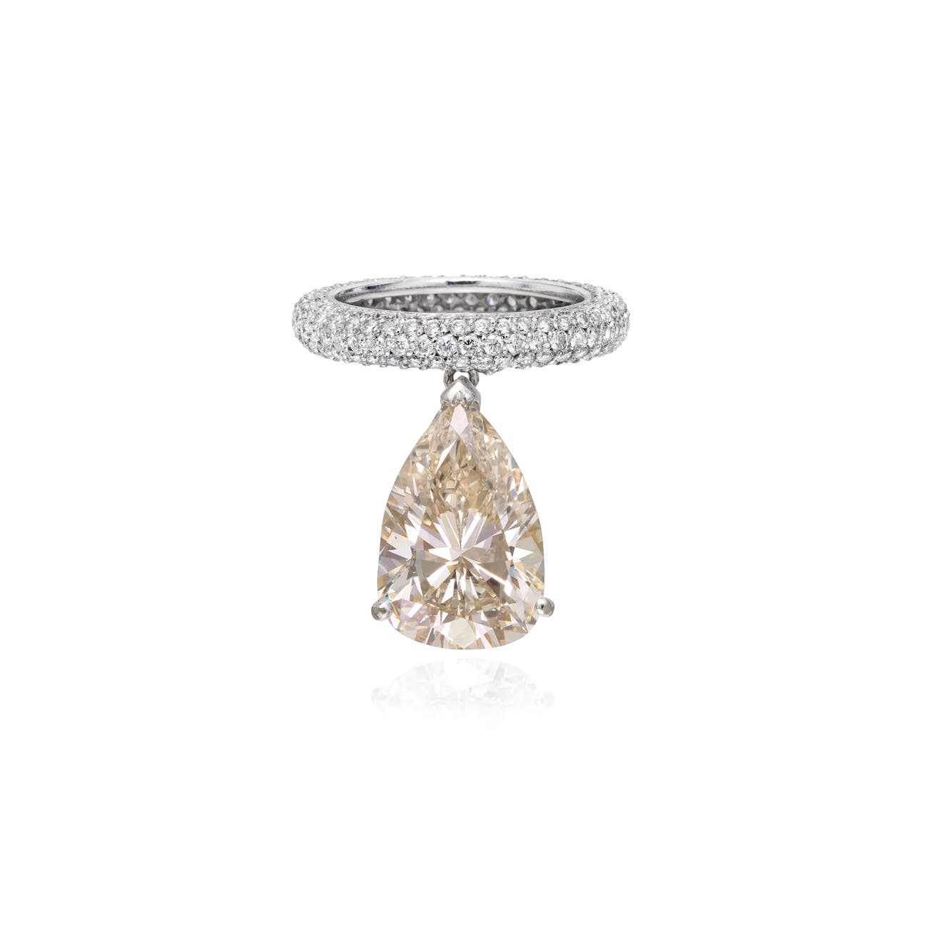 The pavé diamond band, suspending a pear-shaped diamond weighing 7.68 carats, mounted in platinum, size 6 3/4.