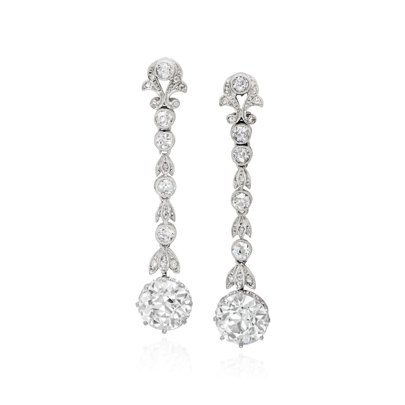 Each set with an old European-cut diamond weighing 2.10 and 2.17 carats respectively, surmounted by circular- and rose-cut diamonds, mounted in platinum, length approximately 1 3/4 inches.