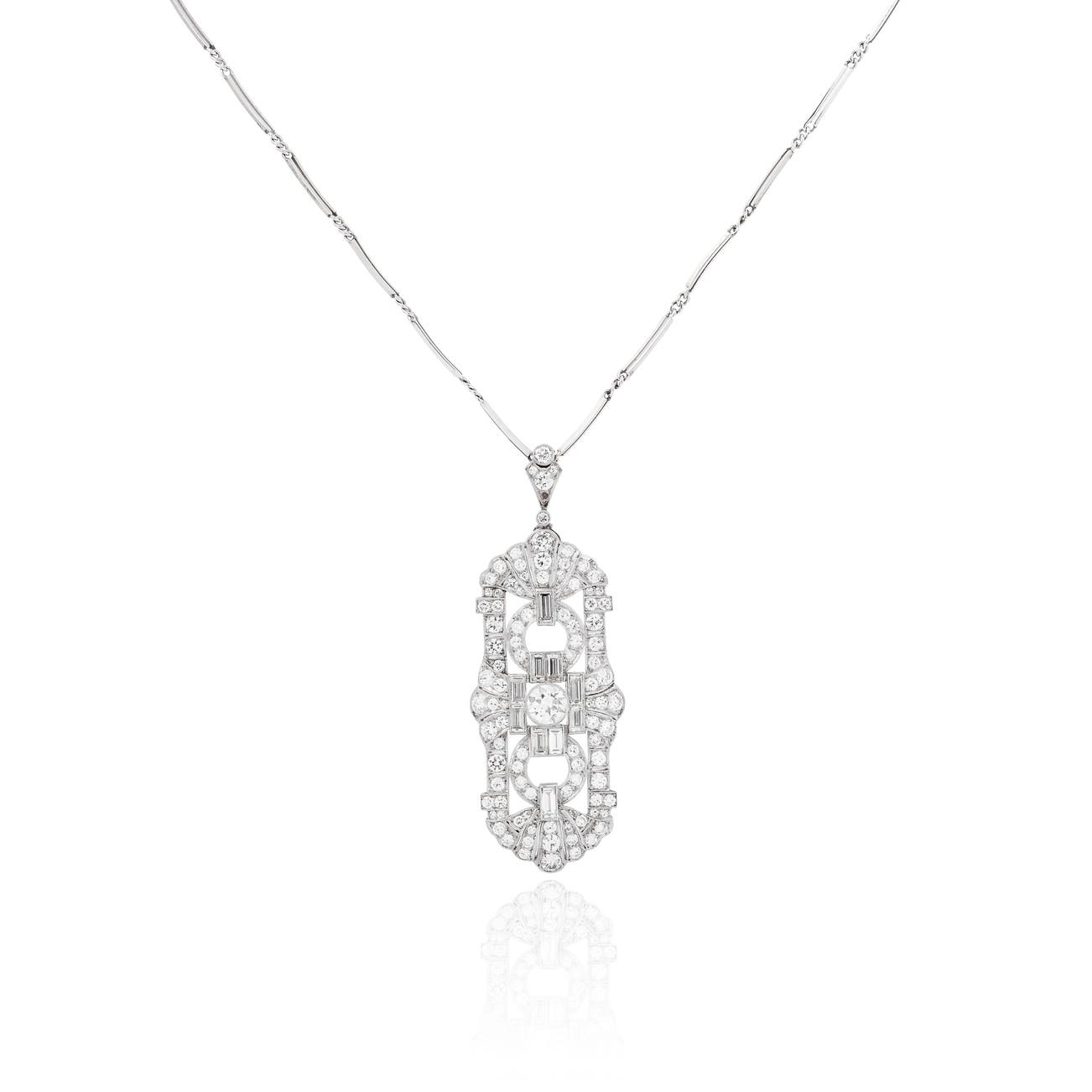 The pendant of openwork geometric design, set with circular-, single-cut and baguette diamonds, measuring approximately 68x25mm, the bail detachable, one small diamond deficient, suspended from a link chain, length approximately 450mm.