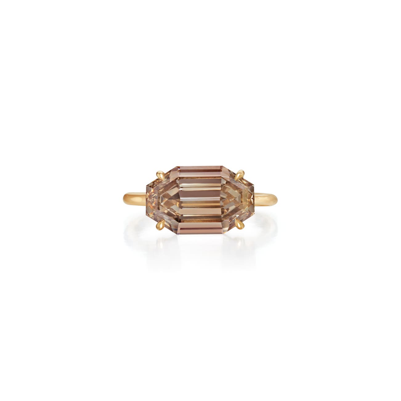 Set with a modified octagonal step-cut fancy orange-brown diamond weighing 6.01 carats, mounted in 18k yellow gold, size 6.