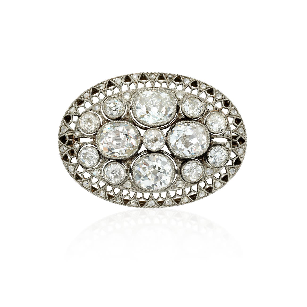 Set with old-, circular- and rose-cut diamonds, mounted in platinum-topped gold, measuring approximately 1 1/8 x 7/8 inches.
