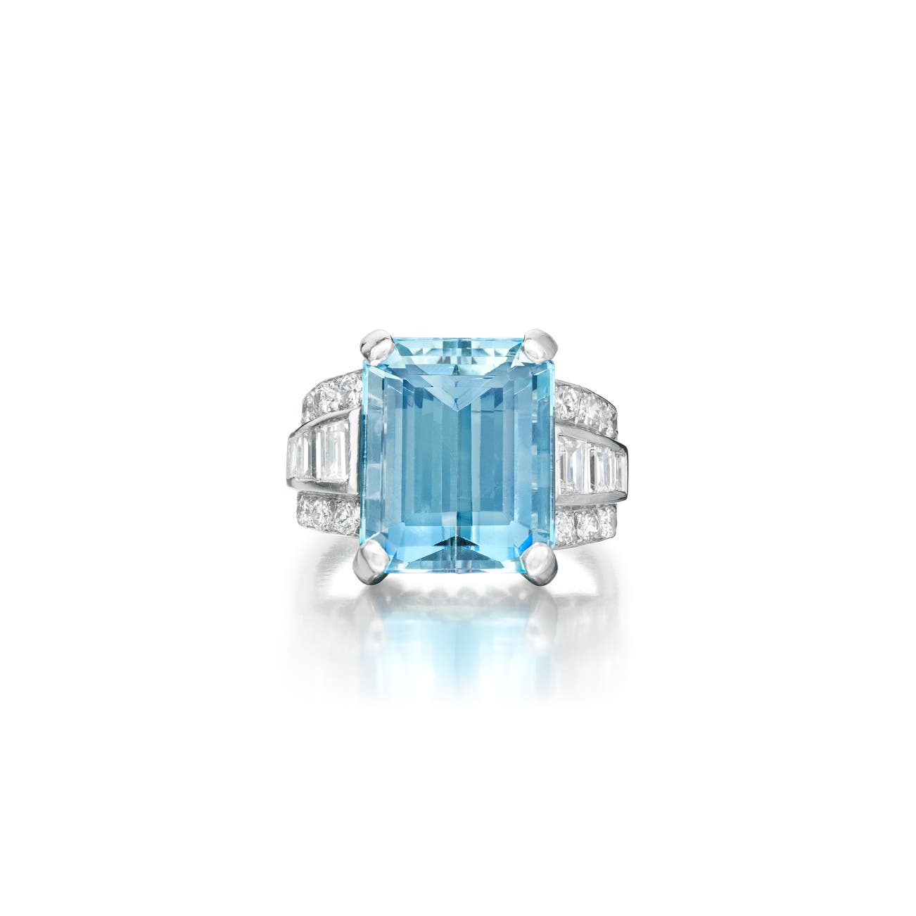 Set with a step-cut aquamarine measuring approximately 15.37 x 12.73 x 9.43mm, accented with baguette and brilliant-cut diamonds, mounted in platinum, size 8 1/2.