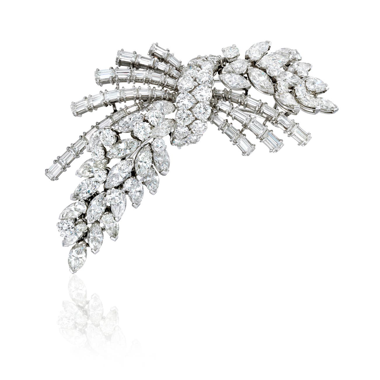 Of foliate design, set throughout with brilliant-, marquise- and baguette-cut diamonds, mounted in platinum, length approximately 2 3/4 x 1 3/4 inches.
