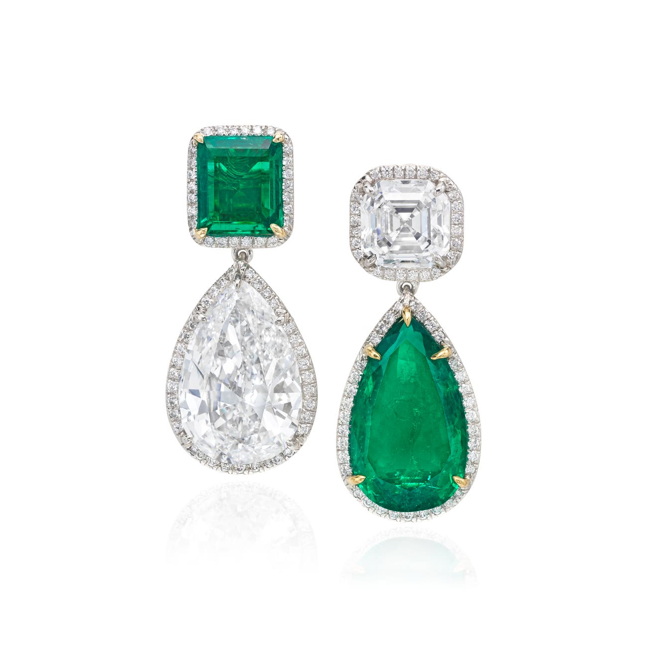One set with a step-cut diamond weighing 3.01 carats, suspending a pear-shaped emerald weighing 6.44 carats, and the other set with a step-cut emerald weighing 1.93 carats, suspending a pear-shaped diamond weighing 7.45 carats, each set within a frame of circular-cut diamonds, mounted in platinum and 18k yellow gold, length approximately 1 1/4 inches.