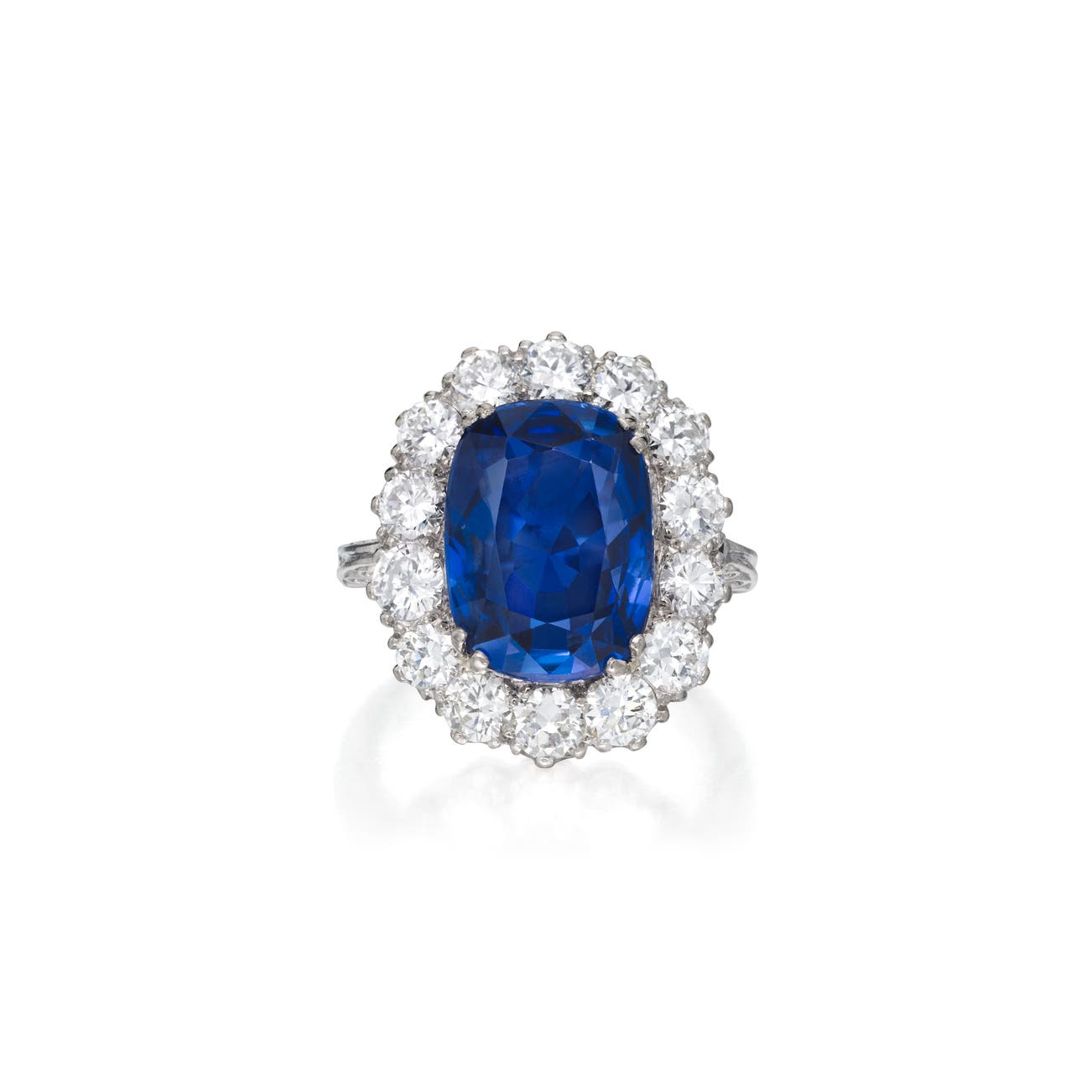Set with a cushion-shaped sapphire weighing 9.28 carats, framed by brilliant-cut diamonds, mounted in 18k white gold, size 6 1/4.