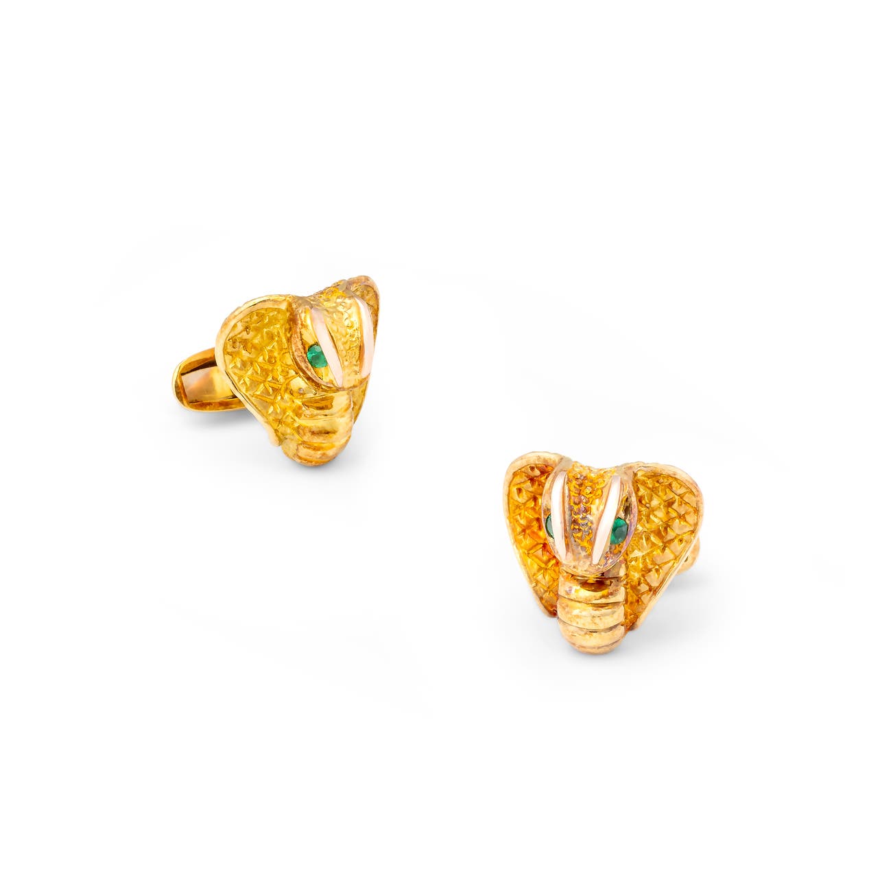 Each designed as a head of a cobra, with texturized gold details imitating scales, the eyes accented with circular-cut emeralds, measuring 20 x 25mm, box and case signed Thomas Sasson.