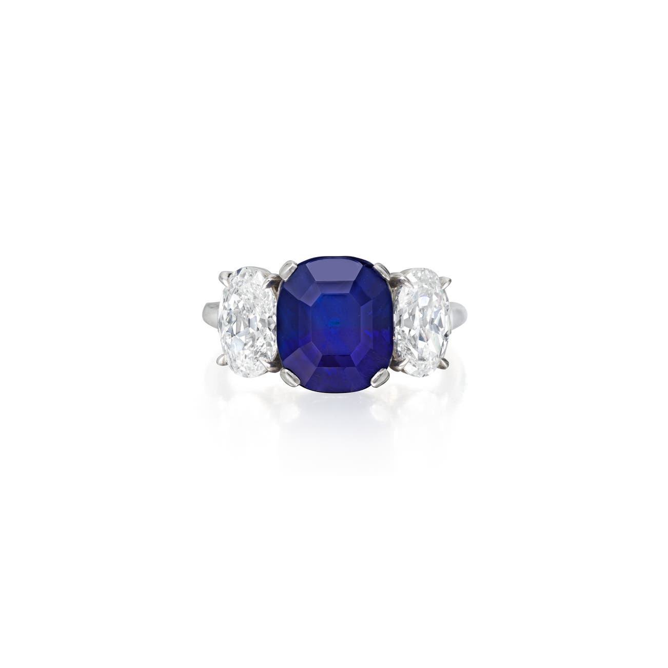 Set with a cushion-shaped sapphire weighing 5.40 carats, between oval diamonds, mounted in platinum, size 6.