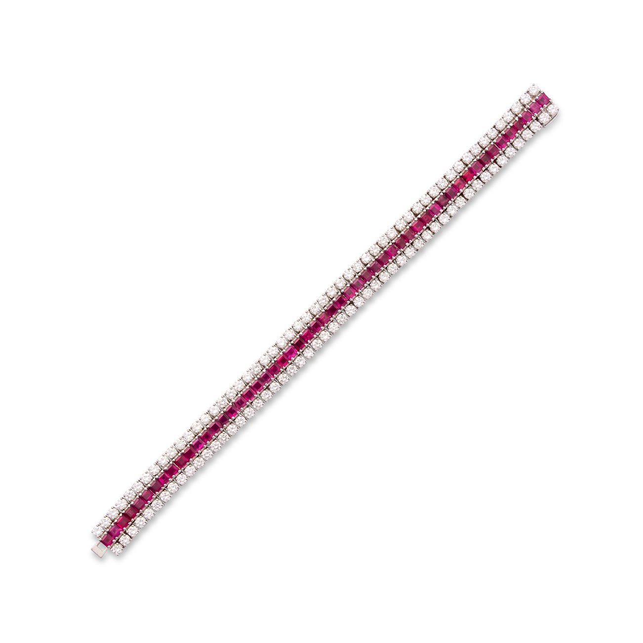 Set with a line of calibré-cut rubies, between rows of brilliant-cut diamonds, length approximately 171mm, marker's mark for Collet Joaillerie Genève.