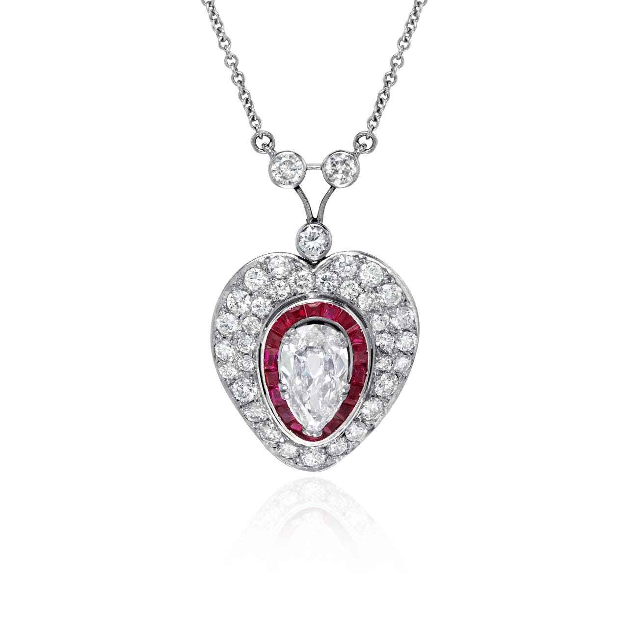 Of heart design, centering a pear-shaped diamond, surrounded by tapered baguette rubies and brilliant-cut diamonds, mounted in platinum, chain length approximately 16 inches, ornament measuring 1 1/4 x 3/4 inches.