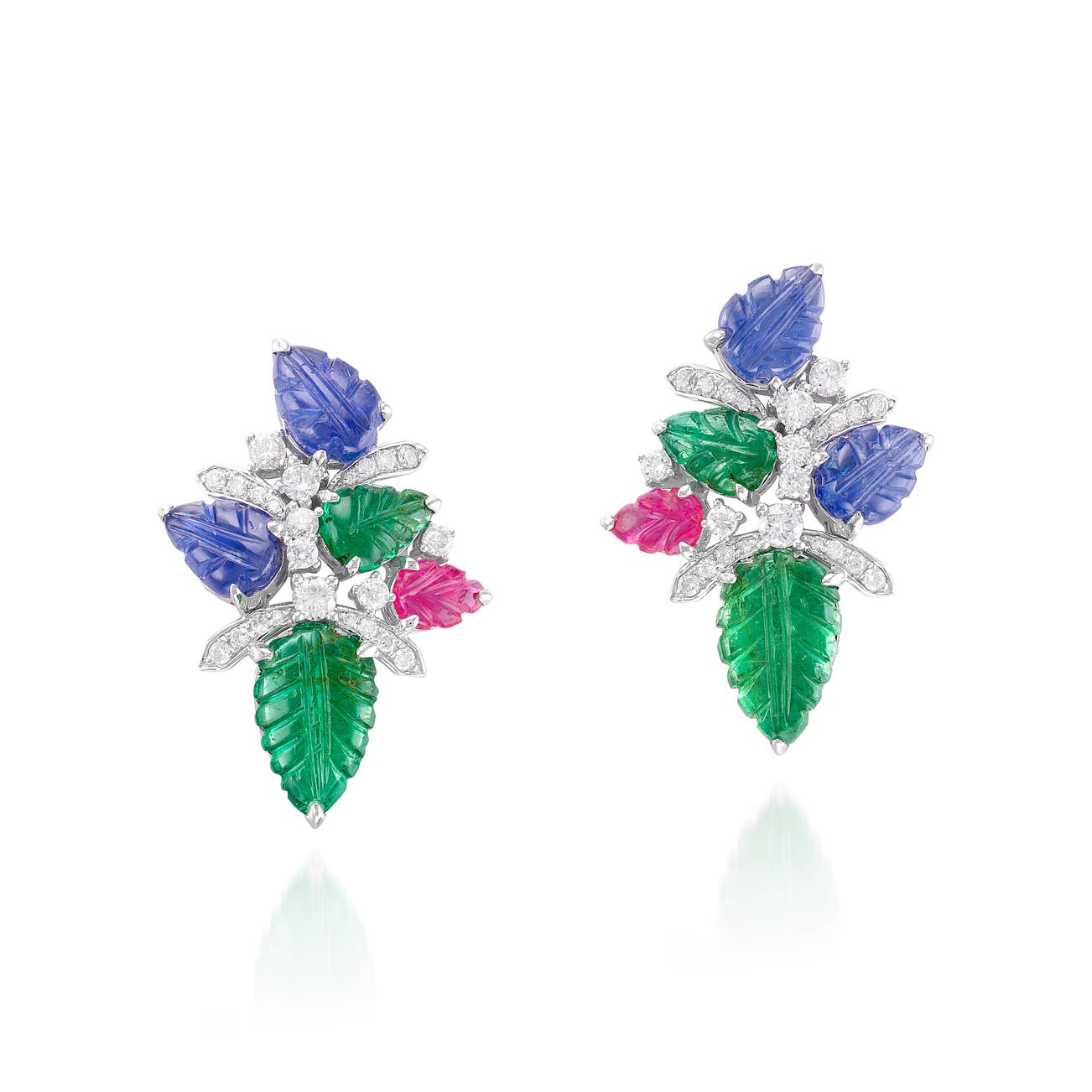 Each set with carved emeralds, sapphires and ruby, decorated with brilliant-cut diamonds, post and silicone fittings, length approximately 29 mm.