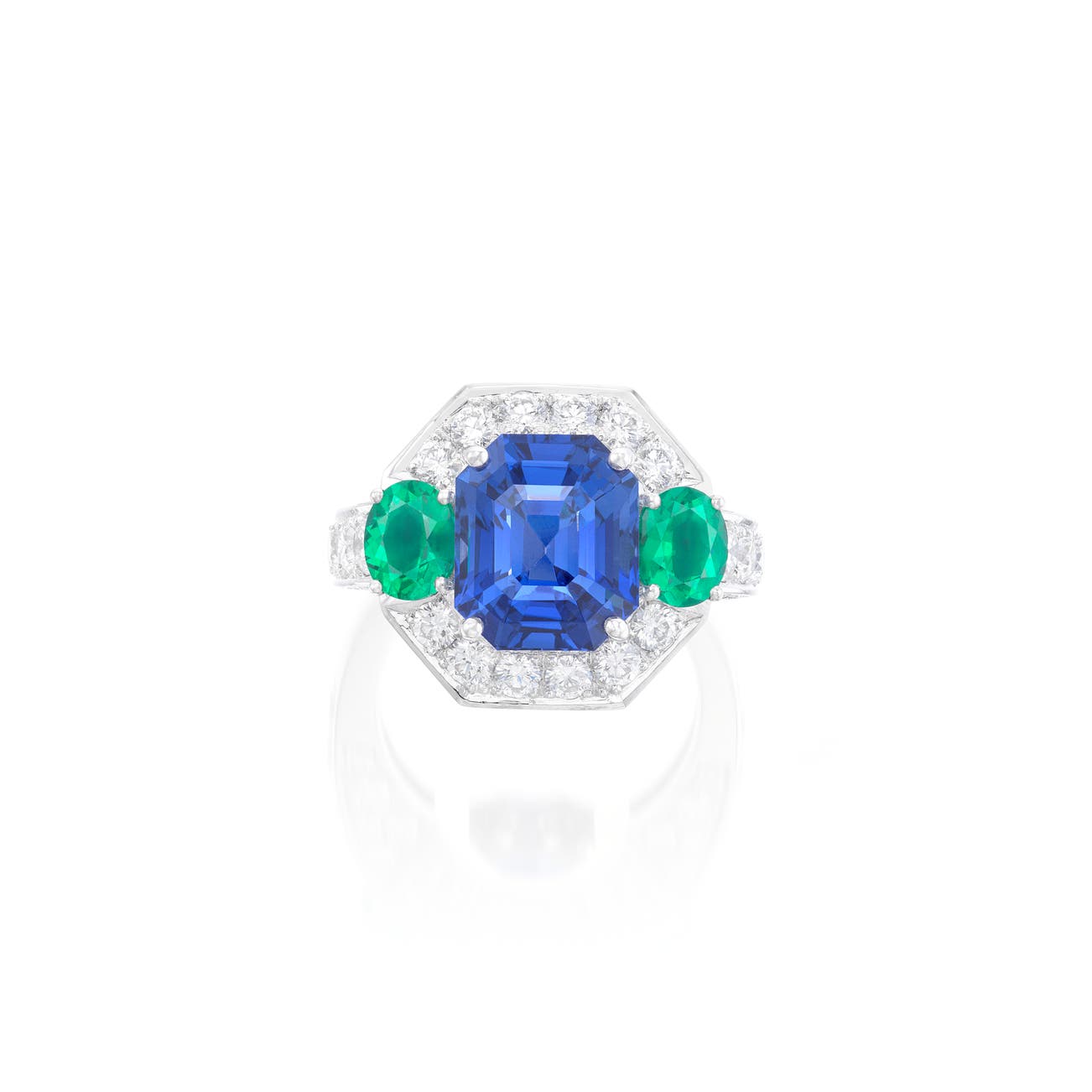 Set with a step-cut sapphire weighing 7.85 carats, flanked by two oval emeralds, to the brilliant-cut diamond surround, gallery and shoulders, size 6¼.